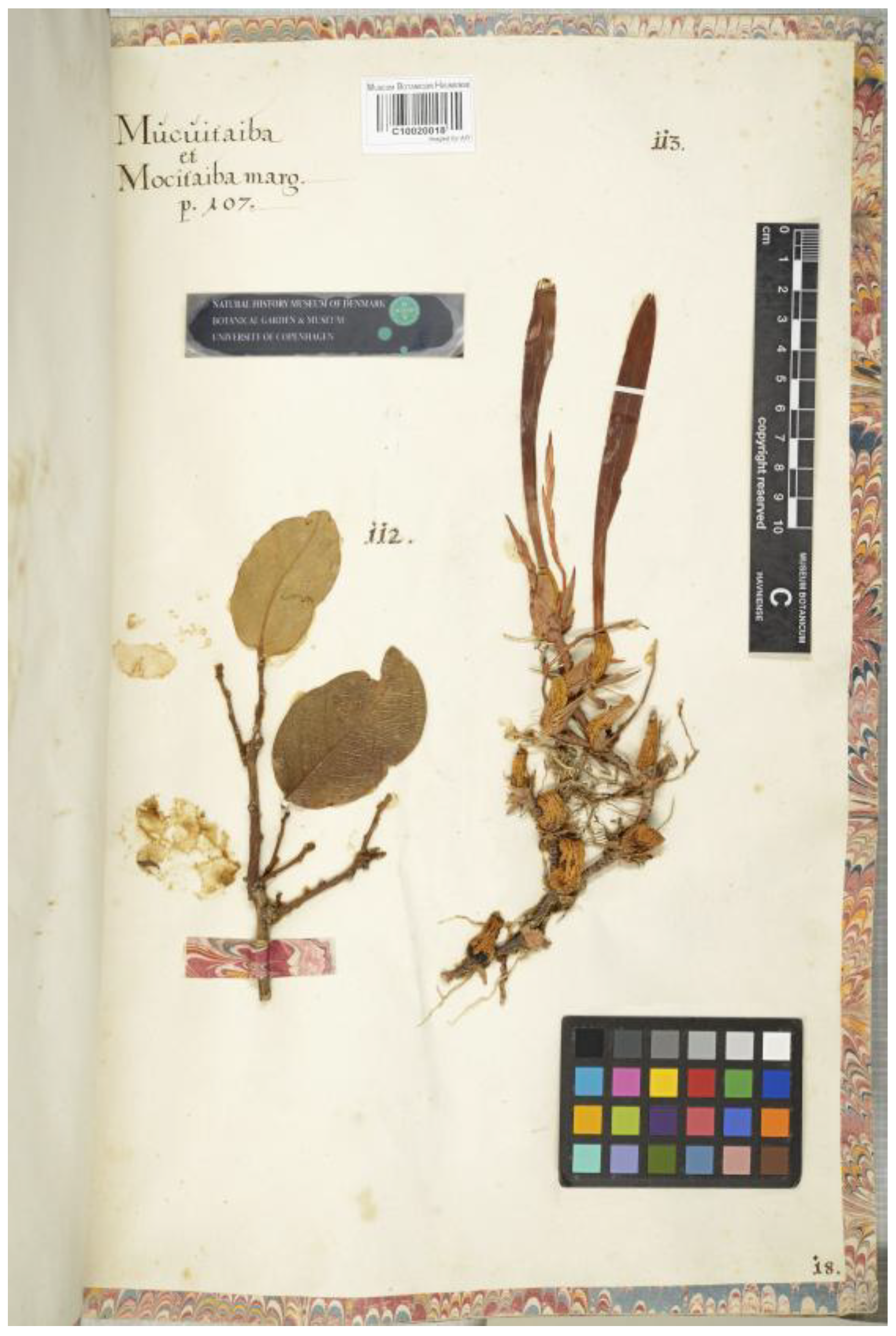 - Moulin, D.; Maule, A.F.; Lima, D.A.; Rahn, K.; Pedersen, T.M. O Herbário de Georg Margraff; Fundação Nacional Pró-Memória: Rio de Janeiro, Brazil, 1986. [Google Scholar]