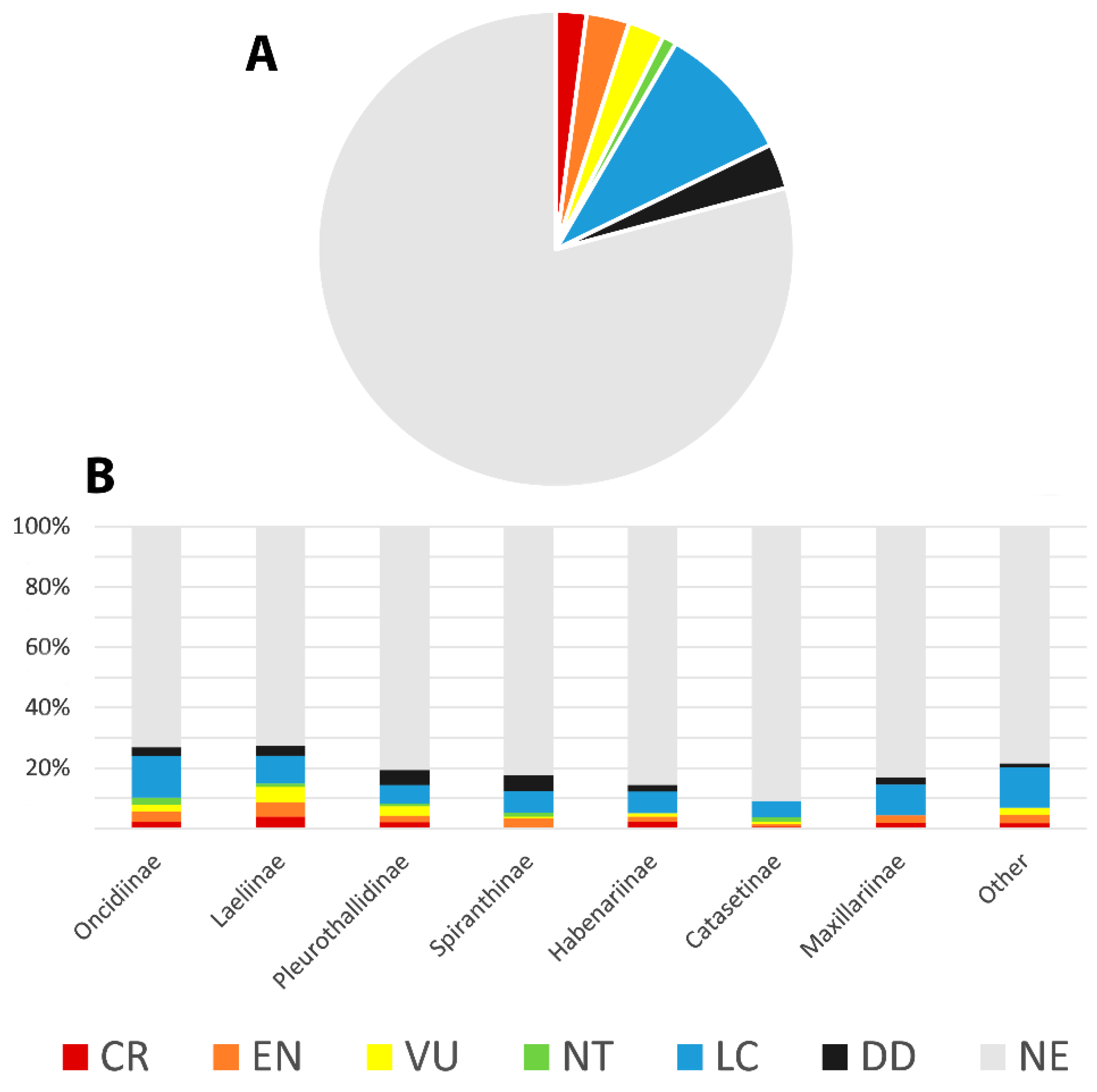 - Endara, L.; Hirtz, A.; Jost, L.; Reynolds, A.; Neubig, K.; Hágsater, E.; Phillip, C.; Simpson, N.; Cornejo, X. Orchidaceae. In Libro rojo de las Plantas Endémicas del Ecuador, 2nd ed.; León-Yánez., S., Valencia., R., Pitman, N., Endara, L., Ulloa-Ulloa, C., Navarrete, H., Eds.; Quito: Publicaciones del Herbario QCA, Pontificia Universidad Católica del Ecuador: Quito, Ecuador, 2017; Available online: https://biowebecuador.azurewebsites.net/floraweb/librorojo/ListaEspeciesPorFamilia/500330. (accessed on 12 November 2025).