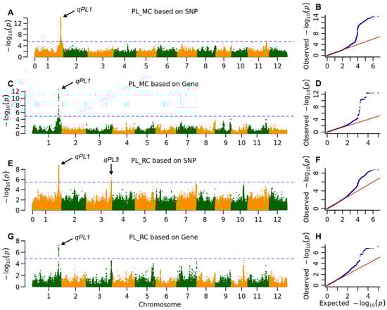 The whole genome association signals of panicle length (PL). Manhattan plot of the association signals for (A) main crop (MC) based on SNP, (C) main crop based on gene, (E) ratoon crop (RC) based on SNP and (G) ratoon crop based on gene, the horizontal blue line indicates the threshold of 3.1 × 10−6 and 1.4 × 10−5 for SNP-base GWAS and gene-based GWAS, respectively. Arrows highlight significant association signals identified on chromosomes 1 and 3, pointing to genetic loci governing panicle length. (B,D,F,H) Q-Q plot of association signals for (A,C,E,G). The blue dots represent the observed -log10(P-values), and the red line indicates the expected null distribution. The close adherence of the data points to the diagonal line indicates that the mixed linear model effectively controlled for population structure. The upward deviation of the tail ends confirms the presence of true genetic associations beyond what would be expected by chance.