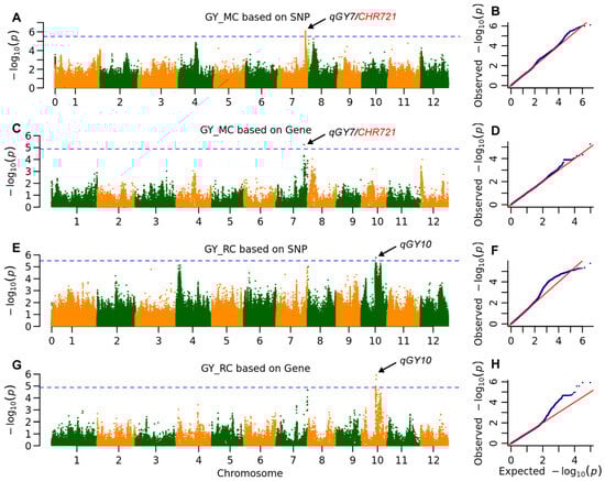 The whole genome association signals of grain yield (GY). Manhattan plot of the association signals for (A) main crop (MC) based on SNP, (C) main crop based on gene, (E) ratoon crop (RC) based on SNP and (G) ratoon crop based on gene, the horizontal blue line indicates the threshold of 3.1 × 10−6 and 1.4 × 10−5 for SNP-base GWAS and gene-based GWAS, respectively. Arrows highlight significant association signals identified on chromosomes 7 and 10, pointing to genetic loci governing grain yield. (B,D,F,H) Q-Q plot of association signals for (A,C,E,G). The blue dots represent the observed -log10(P-values), and the red line indicates the expected null distribution. The close adherence of the data points to the diagonal line indicates that the mixed linear model effectively controlled for population structure. The upward deviation of the tail ends confirms the presence of true genetic associations beyond what would be expected by chance.