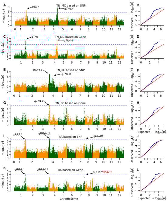 The whole genome association signals of tiller number (TN) and ratooning ability (RA). ACEG). Manhattan plots of genome-wide association signals for TN, based on (A) SNP-based GWAS, (C) gene-based GWAS in the main crop (MC), and (E) SNP-based GWAS, (G) gene-based GWAS in the ratoon crop (RC). Arrows indicated key loci on chromosomes 1 and 4 governing tiller number. (B,D,F,H) Corresponding Q-Q plots for (A,C,E,G) illustrating the distribution of observed versus expected p-values. The horizontal blue lines indicate significance thresholds of 3.1 × 10−6 for SNP-based GWAS and 1.4 × 10−5 for gene-based GWAS. (I,K) Manhattan plots of genome-wide association signals for RA, based on (I) SNP-based GWAS and (K) gene-based GWAS. Arrows indicated key loci on chromosomes 1, 4, 7 and 8 governing ratooning ability. (J,L) Corresponding Q-Q plots for RA. The blue dots represent the observed -log10(P-values), and the red line indicates the expected null distribution. The close adherence of the data points to the diagonal line indicates that the mixed linear model effectively controlled for population structure. The upward deviation of the tail ends confirms the presence of true genetic associations beyond what would be expected by chance.