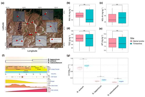 Information on sampling sites and plant samples. (a) Sampling sites in alpine tundra and timberline of Changbai Mountain. Red dots represent research plots and field sampling locations. Contents of soil ammonium nitrogen (NH4+−N) (b), nitrate nitrogen (NO3−−N) (c), total organic carbon (TOC) (d), and available phosphorus (AP) (e) in the sampling sites. For soil samples, n = 14. The Wilcoxon rank-sum test was used to evaluate the significance of differences (**** p < 0.0001 (extremely highly significant); NS, Not Significant, p ≥ 0.05) and the tops and bottoms of the boxes show the 75th and 25th percentiles, respectively. The same applies to the annotations below. (f) Phylogenetic tree illustrating the evolutionary relationships among the three studied Rhododendron species: R. aureum, R. lapponicum, and R. redowskianum (https://timetree.org/, accessed on 25 October 2025). (g) Boxplots of leaf area (denoted as LA) across R. aureum, R. lapponicum and R. redowskianum (n = 20).