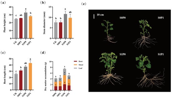 Effects of PGPR inoculation on potato growth under PASP application: (a) plant height (cm), (b) stem diameter (mm), (c) root length (cm), (d) dry weight partitioning (roots, stems, leaves) (g plant−1) and (e) phenotype of potatoes. Data are presented as means ± SD (n = 6). Lowercase letters indicate significant differences among treatments (ANOVA, Duncan’s test, p < 0.05). CK: Control (no treatment); S0P1: PASP only; S1P0: PGPR only; S1P1: PASP + PGPR.