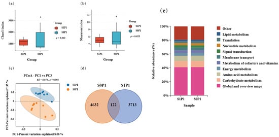 Effect of PGPR inoculation on the rhizosphere microbial community structure and function under PASP application: (a) α-diversity (Chao1 index, p = 0.012, * p < 0.05), (b) α-diversity (Shannon index, p = 0.025, * p < 0.05), (c) Principal Coordinate Analysis (PCoA) based on Bray–Curtis dissimilarity, (d) Venn diagram of OTU distribution, and (e) KEGG pathway composition of the top 10 functional categories (Level 2). S0P1: PASP only; S1P1: PASP + PGPR.