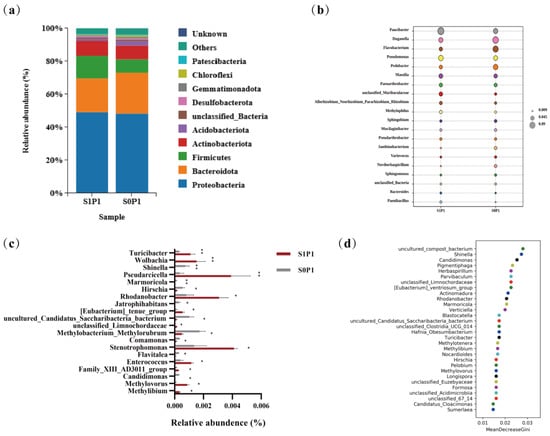 Taxonomic shifts in rhizosphere microbial composition induced by PGPR inoculation under PASP application: (a) phylum-level relative abundance (top 10 taxa), (b) genus-level composition (top 20 taxa; bubble size reflects abundance), (c) differentially abundant genera (top 20 taxa; asterisks indicate significance: * p < 0.05, ** p < 0.01), and (d) random forest analysis of the top 30 genera. S0P1: PASP only; S1P1: PASP + PGPR.
