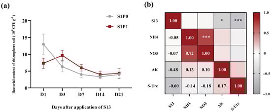 To investigate the colonization of PGPR strains in the rhizospheric soil of potatoes, we employed an antibiotic-marking method for PGPR and detected the rhizospheric soil from 1 to 21 days after PGPR inoculation. Note that CFU counts (used to quantify bacterial content) were not log-transformed prior to analysis, as the data distribution met the requirements of subsequent statistical tests and untransformed values more intuitively reflect the actual abundance of PGPR in the rhizosphere. The results of bacterial content in the rhizospheric soil showed that in the treatment with PGPR inoculation alone (S1P0), the content in the potato rhizospheric soil gradually decreased over time and eventually stabilized, indicating successful colonization of the strain in the potato rhizospheric soil (Figure 7a). Under the condition of PASP application followed by PGPR inoculation (S1P1), compared to the S1P0 treatment, the initial bacterial content (Day 1) in the potato rhizospheric soil was temporarily reduced; thereafter, as the temporary inhibitory effect diminished, the PGPR content showed an increasing trend, followed by a gradual decline and eventual stabilization, indicating that the strain can colonize the potato rhizospheric soil under PASP application (Figure 7a). To further clarify the causal relationship between the PGPR strain and plant growth as well as nutritional effects, we performed a correlation analysis between PGPR content in the rhizospheric soil and soil biochemical indicators. The results showed that the colonization of the PGPR strain had no significant correlation with NH4+-N or NO3−-N but was significantly negatively correlated with AK and S-Ure activity (p < 0.05, p < 0.001). This further indicates that changes in soil biochemical characteristics are the result of the combined action of the rhizospheric microbial community mediated by PGPR inoculation (Figure 7b).