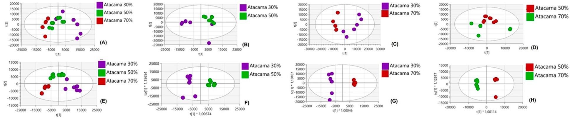 - Llanes, A.; Andrade, A.; Alemano, S.; Luna, V. Metabolomic Approach to Understand Plant Adaptations to Water and Salt Stress. In Plant Metabolites and Regulation Under Environmental Stress; Elsevier: Amsterdam, The Netherlands, 2018; pp. 133–144. [Google Scholar] [CrossRef]