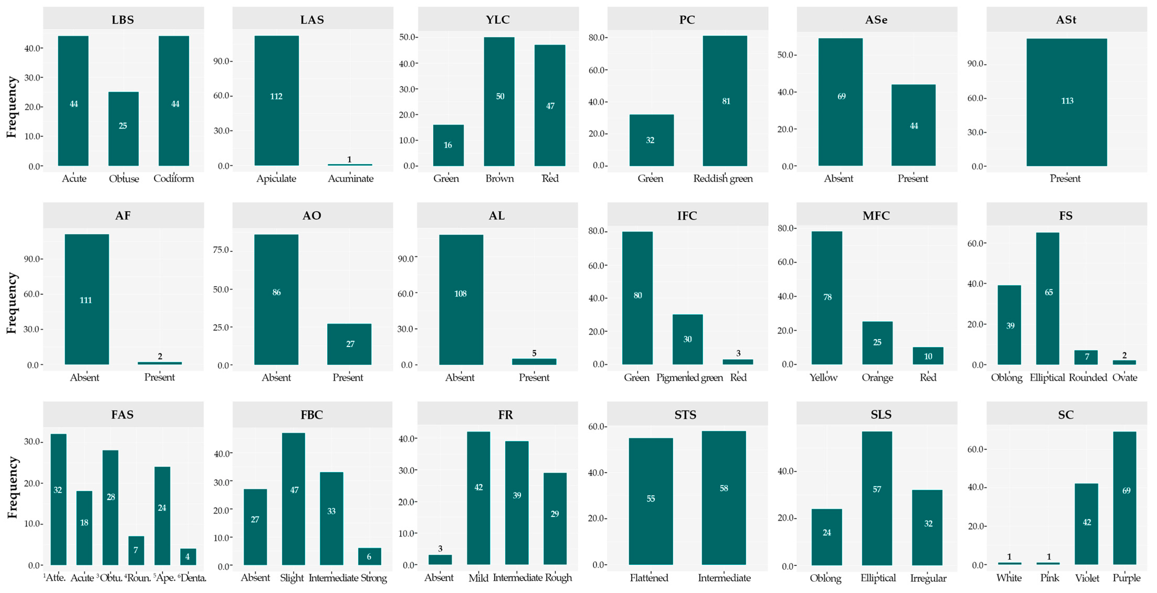 - Yeshitila, M.; Gedebo, A.; Tesfaye, B.; Degu, H.D. Agro-morphological genetic diversity assessment of Amaranthus genotypes from Ethiopia based on qualitative traits. CABI Agric. Biosci. 2024, 5, 95. [Google Scholar] [CrossRef]
