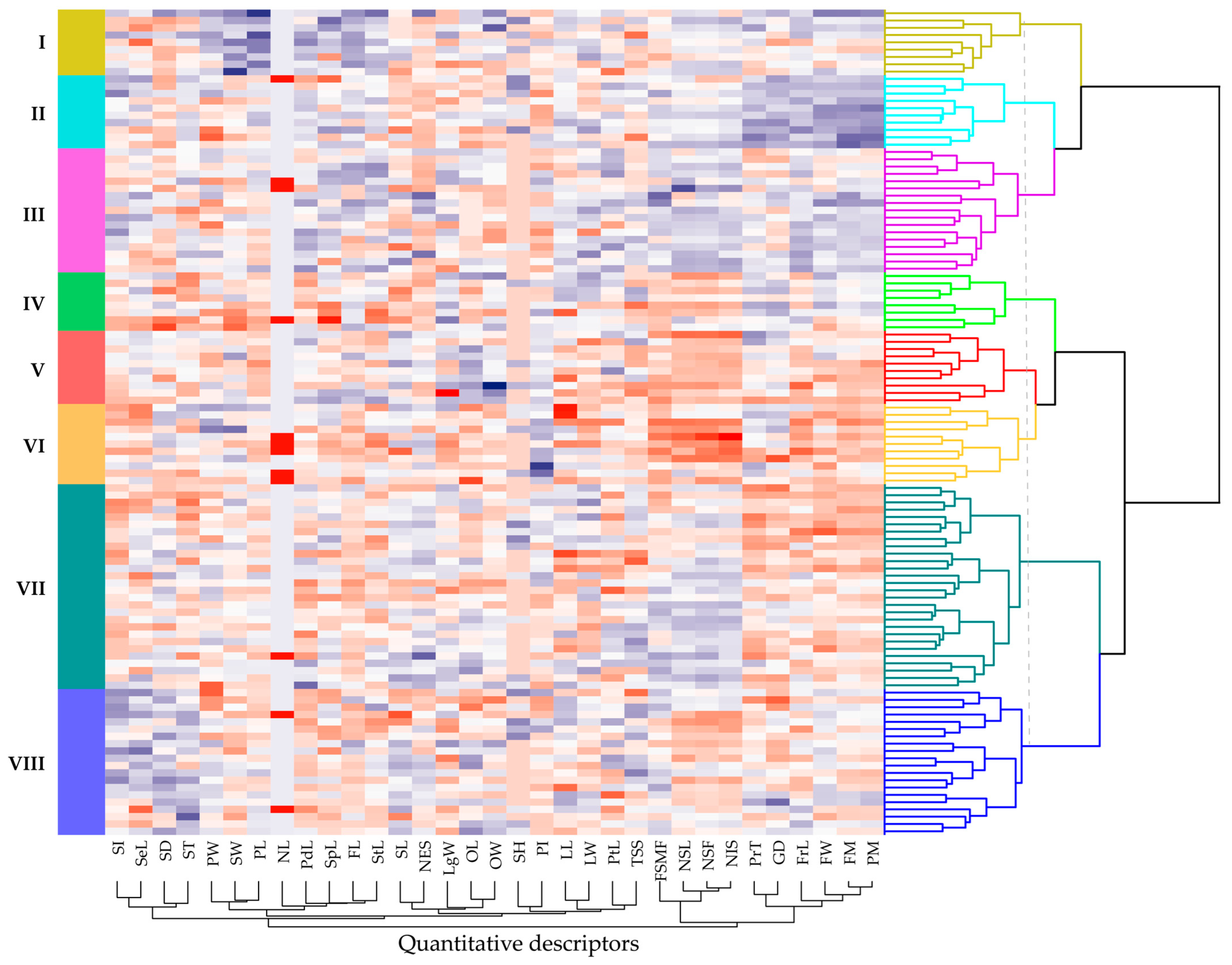 | Descriptors | Cluster I Mean ± S.D | Cluster II Mean ± S.D | Cluster III Mean ± S.D | Cluster IV Mean ± S.D | Cluster V Mean ± S.D | Cluster VI Mean ± S.D | Cluster VII Mean ± S.D | Cluster VIII Mean ± S.D |