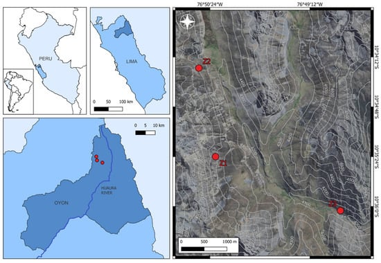 In the provinces of Cajatambo, Yauyos, and Oyón (Lima, Peru), Polylepis forests are found [26,33,34]. These forests face topographic challenges due to the rugged orography, which has significantly restricted research in these areas and generated substantial information gaps across extensive territories. The aim of the present study was to develop a comprehensive inventory of vascular plants associated with three queñua (Polylepis) forests under different levels of human activity in the province of Oyón, Peru.