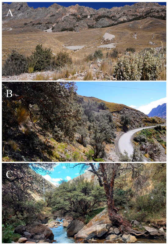 The first evaluated forest, Zone 1 (Z1), is located at coordinates 10°35′22.8″ S, 76°50′21.9″ W (WGS84), between 4350 and 4400 m a.s.l., and is characterized by a landscape dominated by herbaceous vegetation with scattered shrubs (Figure 2A). The second forest, Zone 2 (Z2), is located at 10°34′21.2″ S, 76°50′36.1″ W, at 4500 m a.s.l., in an area near the Raura Mine, and was highly fragmented due to the construction of the Oyón-Cajatambo road (Figure 2B). The third forest, Zone 3 (Z3), located at 10°36′03.1″ S, 76°48′52.7″ W, at 4000 m a.s.l., is crossed by the Ushpa River and the same road, which determines the existence of two distinct sectors (upper and lower) with evidence of recent anthropogenic disturbance through logging and firewood extraction (Figure 2C).