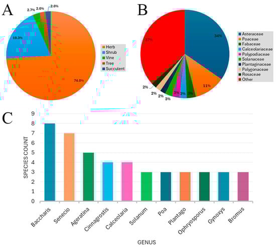 The taxonomic composition was dominated by the Asteraceae family (52 species) (Figure 3B), a finding consistent with its rank as the second most species-rich family in Peru and its well-documented success in high-Andean ecosystems [62,63]. The success of this family in these ecosystems is attributed to adaptive traits such as pubescent or succulent leaves and deep roots, which allow them to thrive in extreme conditions [34]. The high representation of genera like Baccharis (8 spp.), Senecio (7 spp.), and Ageratina (5 spp.) (Figure 3C) also aligns with their known role as effective colonizers in disturbed high-Andean environments [64,65]. Consistent with other high Andean floristic inventories, Asteraceae and Poaceae were the dominant families [49,66,67,68,69,70]. Our study confirmed the dominance of Asteraceae across the entire gradient, while Poaceae (17 species) was more prominent at lower elevations, an altitudinal alternation that has been documented in previous research [71].
