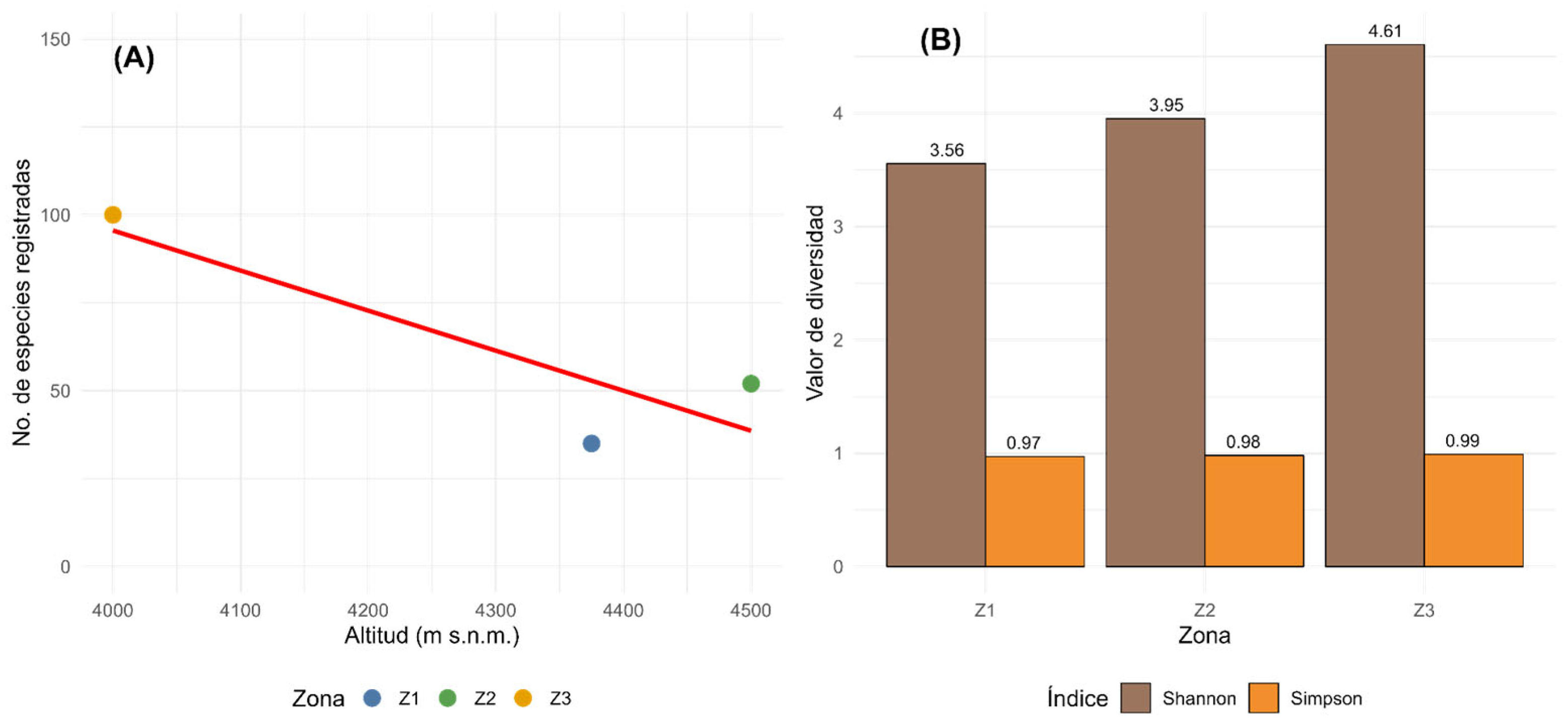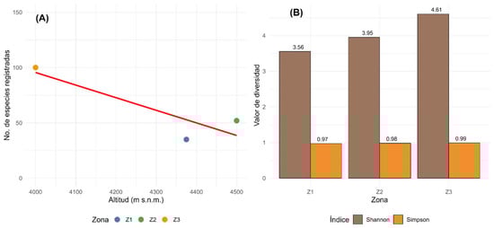 (A) Altitudinal gradient effect on the number of recorded species across the three study zones. (B) Diversity indices (Shannon and Simpson) of the three study zones.