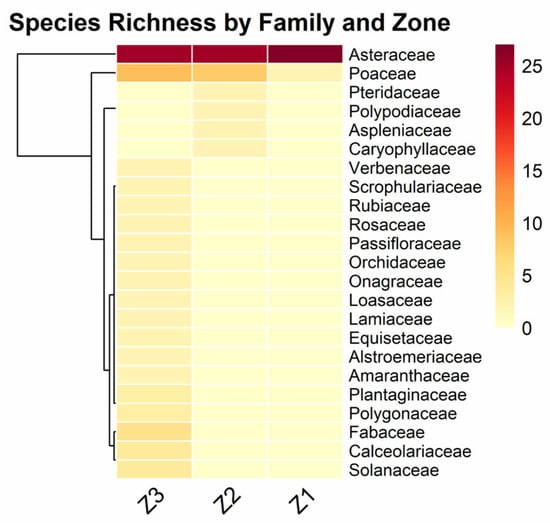 The lateral dendrogram of the heat map groups families according to their distribution patterns, showing two main clusters: one composed of widely distributed families (Asteraceae and Poaceae) and another of families with more restricted distribution. Most families with low species richness are concentrated in higher elevation zones (Z1 and Z2), while Z3 presents the greatest diversity both in number of families and in species richness per family.