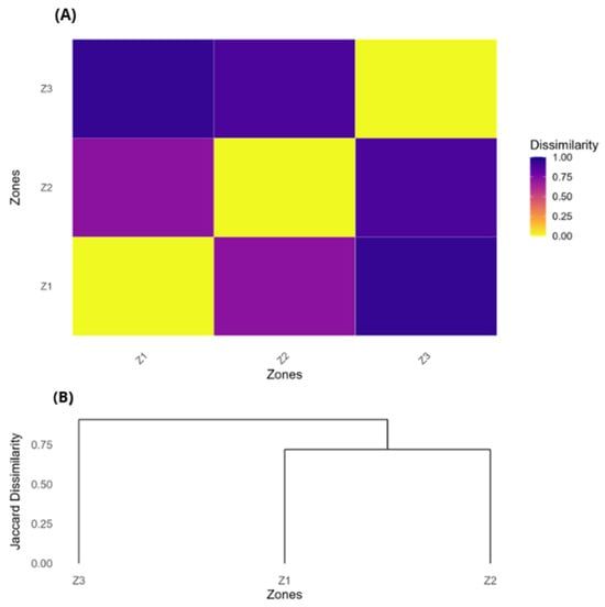 To quantify the degree of this floristic dissimilarity, a Jaccard index was calculated (Figure 8A). The dissimilarity matrix confirmed that Zone 3 was the most distinct zone, with high dissimilarity values relative to Zone 1 (0.94) and Zone 2 (0.88). In contrast, Zone 1 and Zone 2 showed a lower dissimilarity value of 0.72, indicating a greater floristic similarity between them.