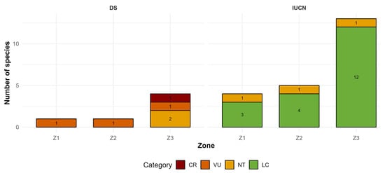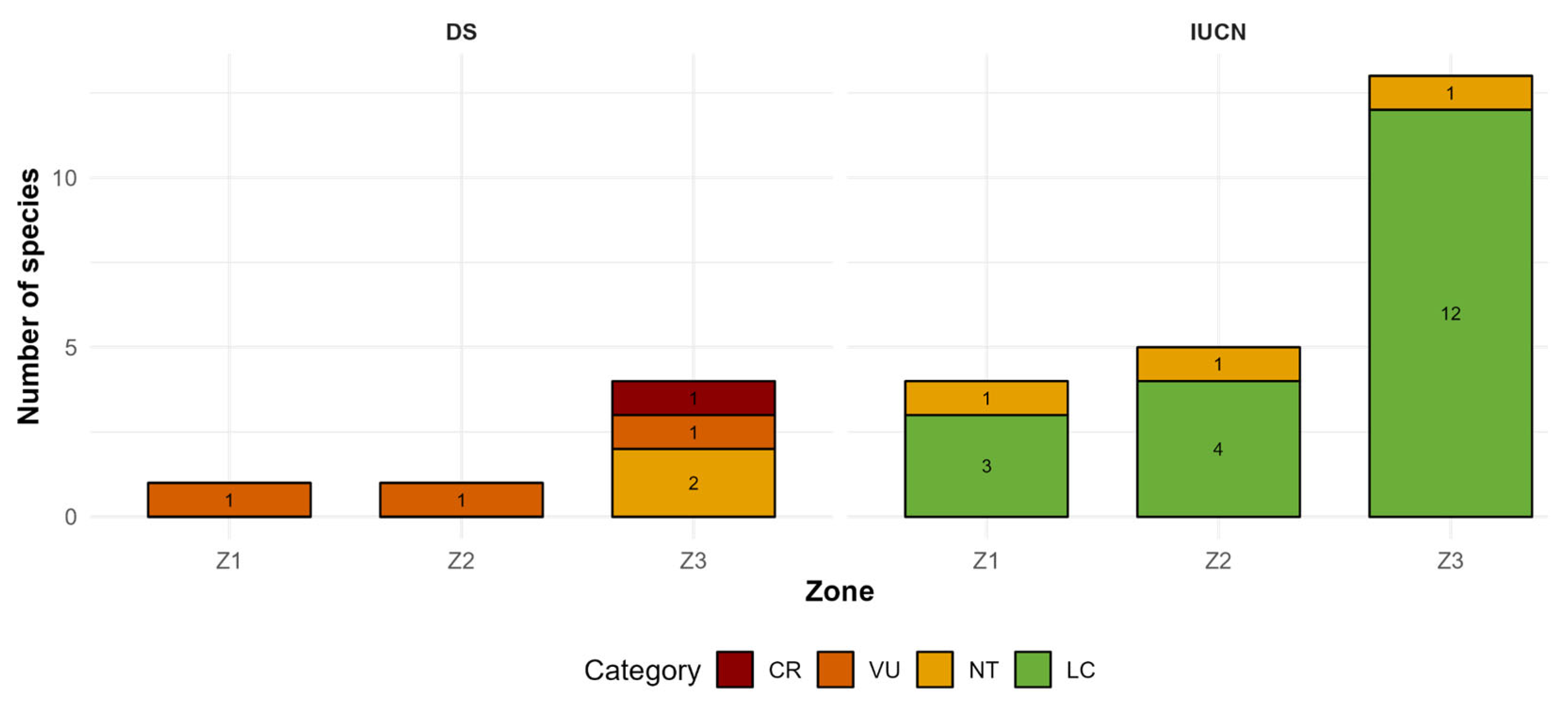 Distribution of threatened species by study zones according to Peruvian Supreme Decree categories (CR: Critically Endangered, VU: Vulnerable, NT: Near Threatened) and IUCN Red List categories (NT: Near Threatened, LC: Least Concern).