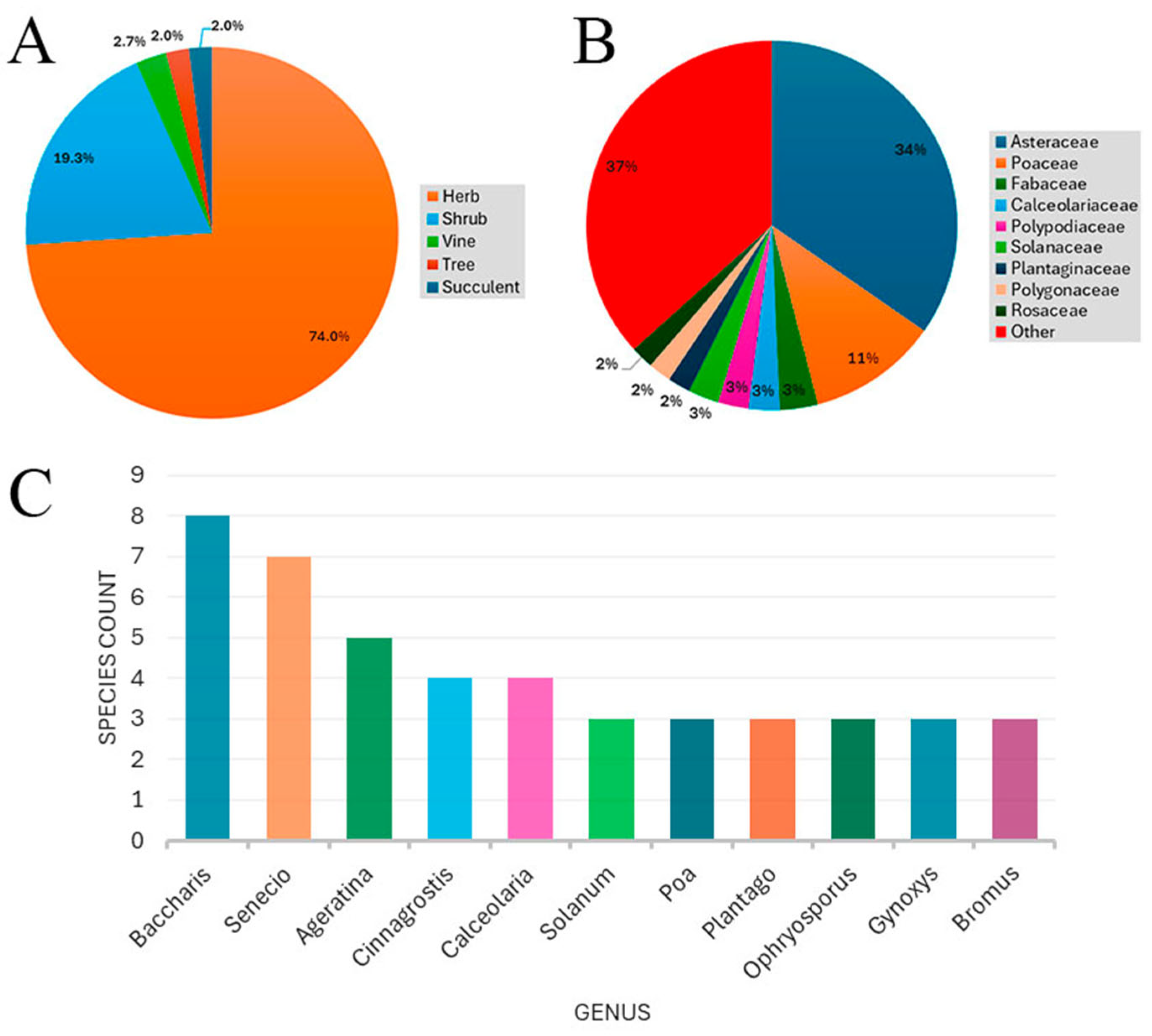 A total of 150 vascular plant species were recorded, distributed across 100 genera and 47 families (Table 1). The distribution by life form showed a predominance of herbs with 110 species (73.33%), followed by shrubs with 29 species (19.33%), vines with 4 species (2.67%), succulents and trees with 3 species (2%), and one stoloniferous species (0.67%) (Figure 3A). The most diverse families were Asteraceae (52 species), Poaceae (17 species), Fabaceae (5 species), Calceolariaceae (4 species), Solanaceae (4 species) and Polypodiaceae (4 species), which together accounted for 57.3% of the total species (Figure 3B). The best represented genera were Baccharis L. (8 species), Senecio L. (7 species), Ageratina Spach (5 species), and Calceolaria L. and Cinnagrostis Griseb. (4 species each) (Figure 3C).