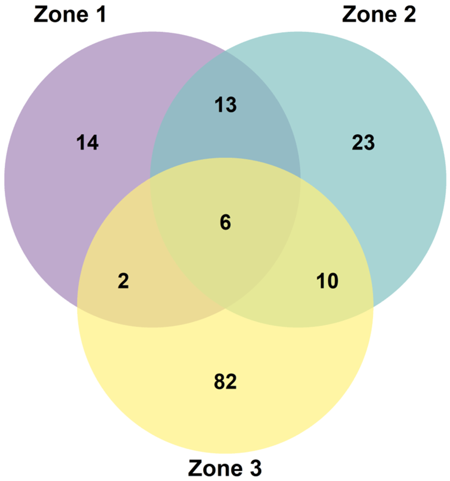 The floristic overlap among the three study zones was first visualized using a Venn diagram (Figure 7). This analysis revealed a high number of unique species in the lowest elevation zone (Z3) and a low overall similarity among the sites. Specifically, Zone 3 contained 82 exclusive species, while the higher-elevation forests, Zone 1 and Zone 2, had only 14 and 23 exclusive species, respectively. The greatest overlap was observed between these two higher-altitude sites, which shared 13 species.