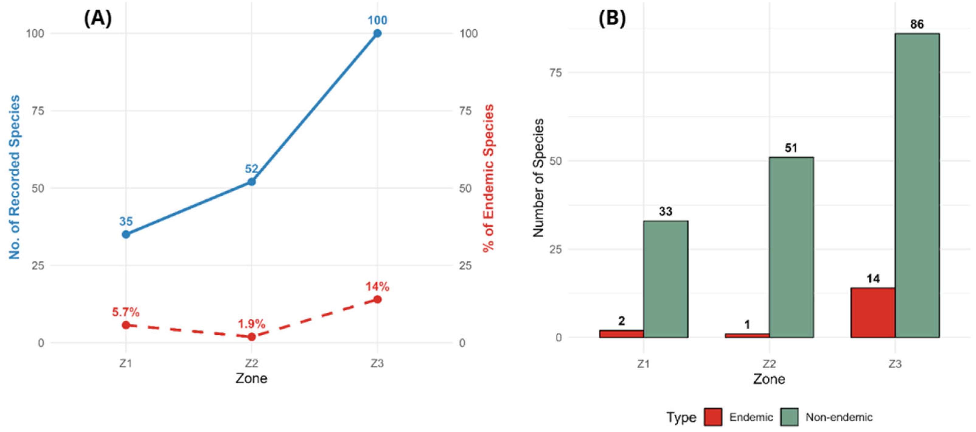 (A) Relationship between total species diversity and endemic species richness across study zones. (B) Comparison of the absolute number of endemic and non-endemic species in each zone.