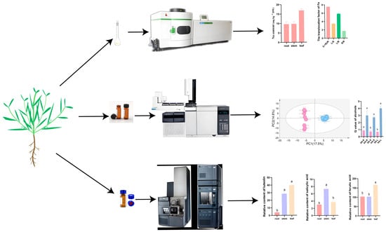 To determine the element content of K. scoparia, the plants were divided into leaf, stem, and root. Three biological replicates were used for each part. The contents of B, Fe, Mn, Ni, Mo, Na, K, Ca, Mg, Cu, and Zn were determined following the method of Chen et al. [31]. The samples were dried at 60 °C for 48 h in a constant drying oven. The dried samples were pulverized. A 0.1 g portion of the powdered sample was soaked in 10 mL 95% HNO3. The mixture was heated on a graphite plate (EH45A plus, LabTech, Beijing, China) to achieve digestion at 130 °C and until the sample was completely clarified. The samples were adjusted to a final volume of 25 mL with the deionized water. The element content was detected using an inductively coupled plasma emission spectrometer (ICP-OES Optima 8000, Perkin Elmer, Waltham, MA, USA). The element content was calculated according to the standard curve. Factors of transfer factor (TF) were calculated by dividing the ionic element content of the above-ground tissues by the ionic element content of the root system [31].