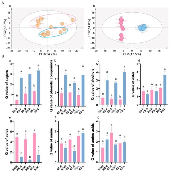 Metabolic divergence between K. scoparia and S. salsa. (A) PCA and OPLS-DA score plots of metabolite profiles. (B) Q-values for annotated metabolite classes. SS-R, SS-S and SS- denote roots, stems, and leaves of S. salsa (SS); KS-R, KS-S and KS-L denote roots, stems, and leaves of K. scoparia (KS). Data are means ± SE of three biological replicates; different letters represent significant differences (p < 0.05).