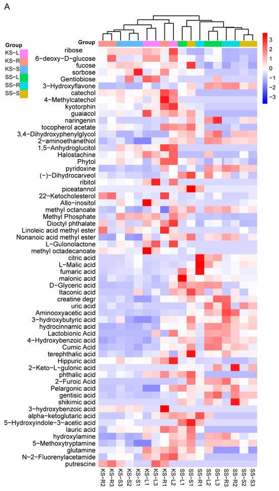 The accumulation of metabolites in the roots, stems, and leaves under different treatments was profiled using untargeted metabolomics. PCA and OPLS-DA score plots showed the tight clustering of biological replicates and clear separation among treatments (Figure 3A(a)); PC1 and PC2 explained 24.7% and 18.7% of the variance, respectively. A total of 204 metabolites were detected, of which 83 were significantly different (VIP > 1, p < 0.05) among groups (Figure 3A(b)). Chemical classification assigned these metabolites to seven major classes: amino acids (9), sugars (5), organic acids (28), alcohols (11), esters (7), amines (6), and phenolic compounds (6). The Q-values for sugars, phenolics, and alcohols were markedly higher in K. scoparia than in S. salsa, whereas organic acids were more abundant in S. salsa (Figure 3B(a–e)); the differences in amines and amino acids were not significant (Figure 3B(f,g)), indicating species-specific metabolic strategies.