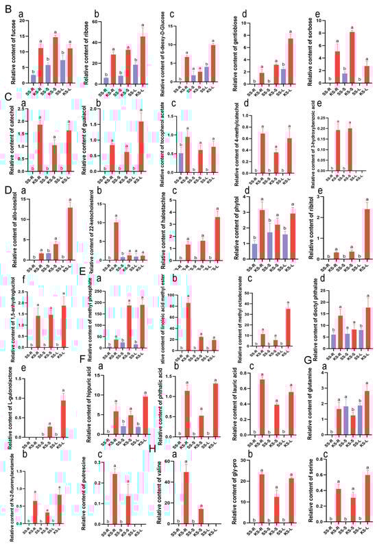 Differentially accumulated metabolites in K. scoparia. (A) Hierarchical clustering heatmap of significantly different metabolites across tissues. Relative contents in K. scoparia of (B) sugars, (C) phenolic compounds, (D) alcohols, (E) esters, (F) organic acids, (G) amines, (H) amino acids. SS-R, SS-S and SS-L denote roots, stems, and leaves of S. salsa (SS); KS-R, KS-S and KS-L denote roots, stems, and leaves of K. scoparia (KS). Significantly different metabolisms are summarized from three biological replicates and presented as the mean ± standard error. Different letters represent significant differences (p < 0.05).