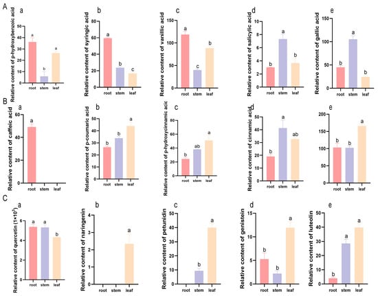 Relative content of phenolic compounds in K. scoparia. (A) Relative content of C6C1-compounds. Relative content of p-hydroxybenzoic acid (a), syringic acid (b), vanillic acid (c), salicylic acid (d) and gallic acid (e). (B) Relative content of C6C3-compounds. Relative content of caffeic acid (a), p-coumaric acid (b), p-hydroxycinnamic acid (c), cinnamic acid (d) and ferulic acid (e). (C) Relative content of C6C3C6-compounds. Relative content of quercetin (a), naringenin (b), petunidin (c), genistein (d) and luteolin (e). Different letters indicate significant differences among treatments (p < 0.05).