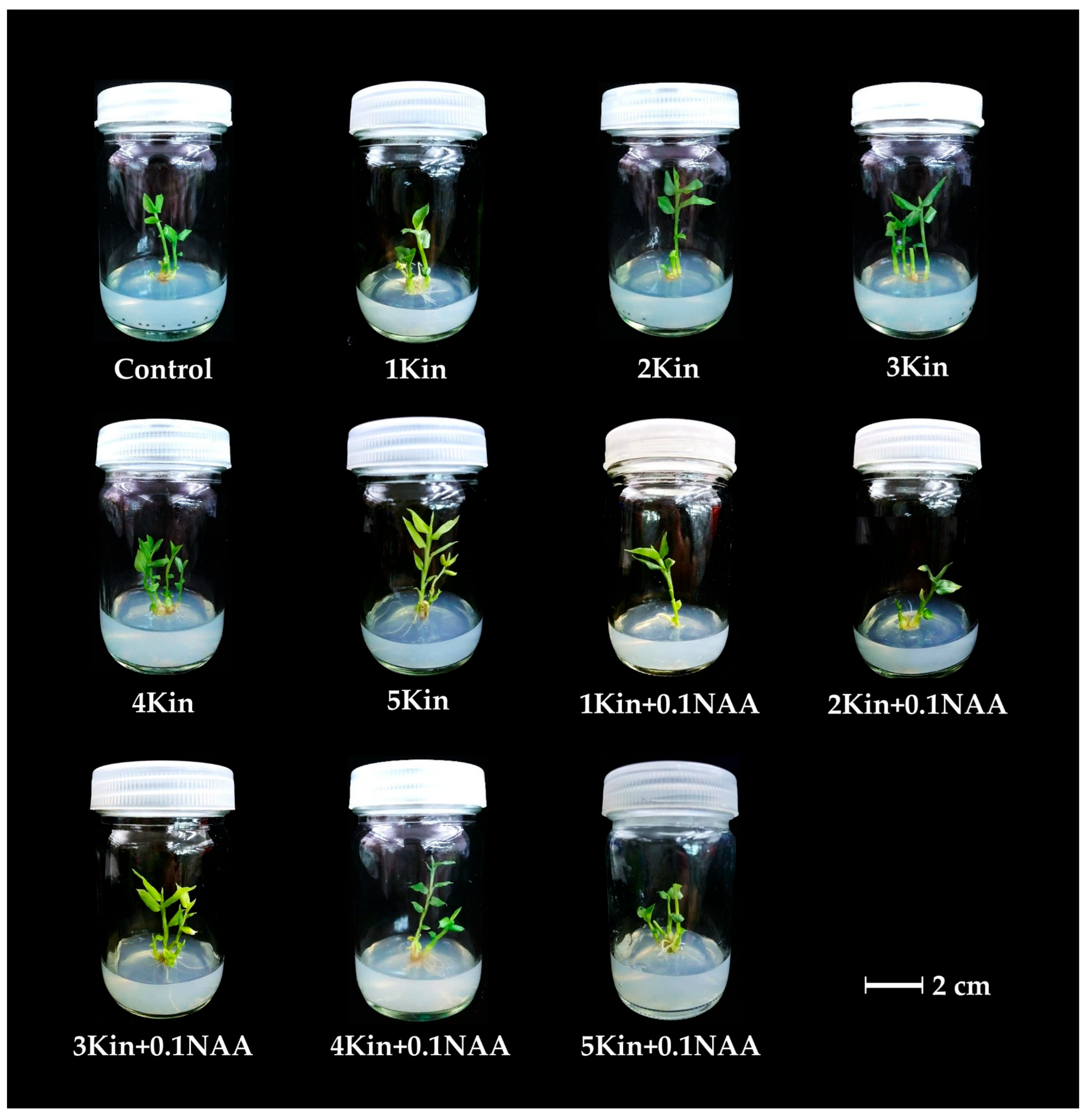 2.1.2. Effect of Kinetin in Combination with NAA on Shoot and Root Production