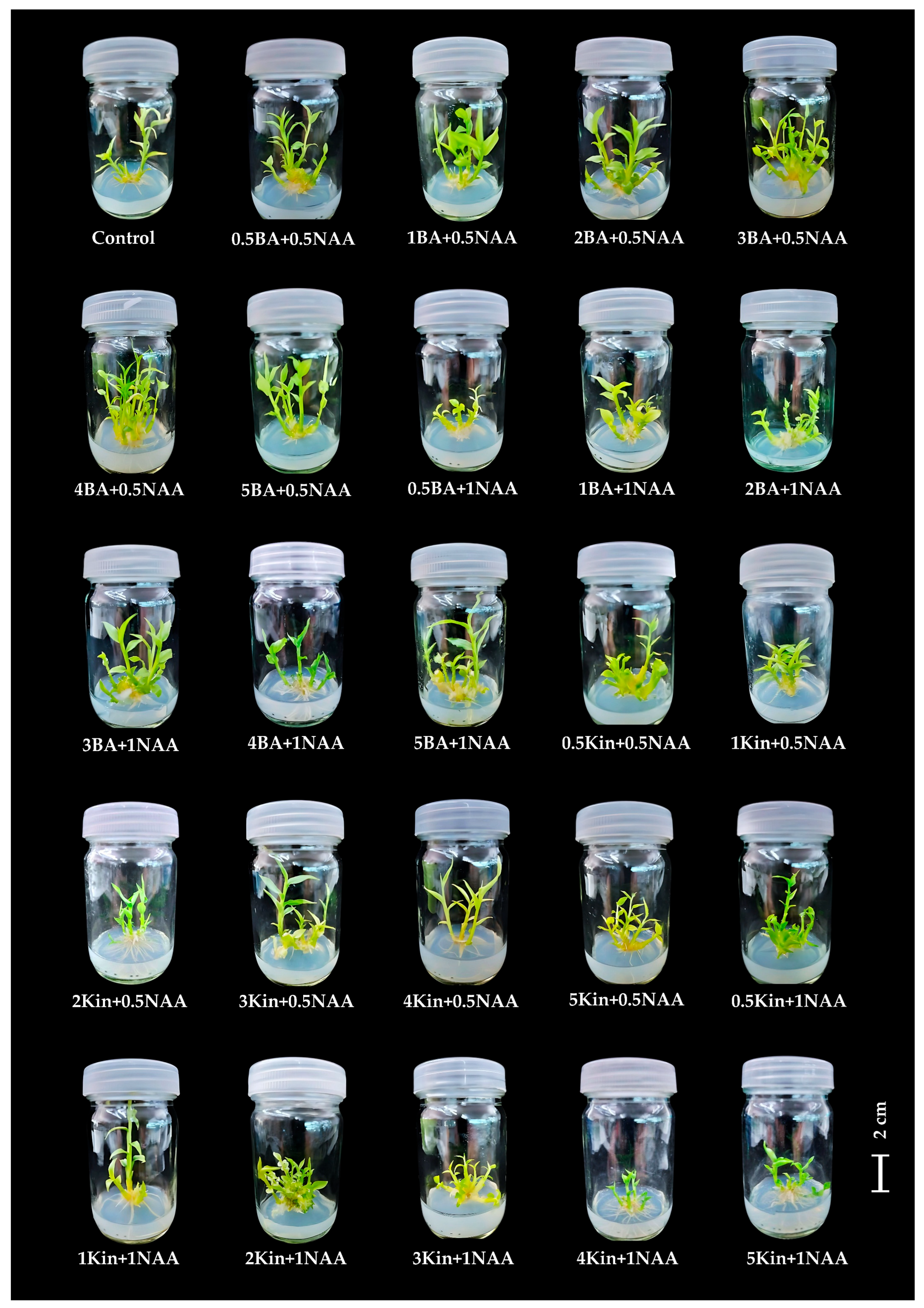 The combination of BA with 0.1 mg/L NAA further promoted shoot regeneration, with the best response observed on medium containing 4 mg/L BA and 0.1 mg/L NAA, producing 5.10 ± 1.02 shoots/explant with a mean shoot length of 2.17 ± 0.21 cm (Figure 2). In terms of root development, the medium supplemented with 2 mg/L BA and 0.1 mg/L NAA exhibited the highest average root production (8.50 ± 2.20 roots/explant) with a root length of 1.53 ± 0.16 cm (Table 1). By contrast, the control medium yielded only 1.70 ± 0.26 shoots/explant with a mean shoot length of 1.47 ± 0.11 cm and 1.10 ± 0.62 roots/explant with an average root length of 0.36 ± 0.21 cm (Figure 2).