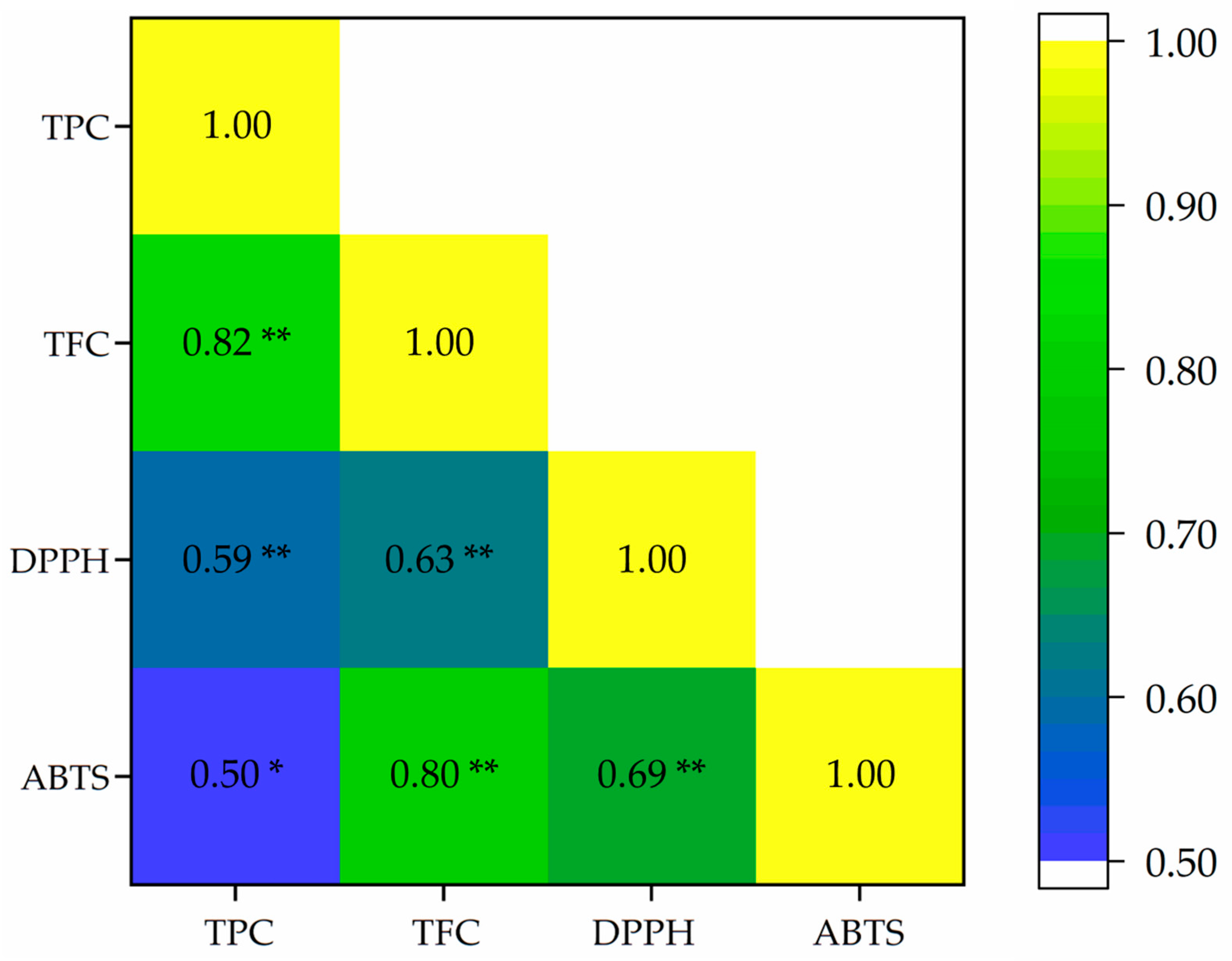 The Pearson correlation coefficients among TPC, TFC, and the antioxidant activities (DPPH and ABTS assays) are presented in Figure 6. A strongly positive correlation was observed between TPC and TFC (r = 0.82, p < 0.01). TFC also exhibited a strongly positive correlation with ABTS radical scavenging activity (r = 0.80, p < 0.01) and a moderate correlation with DPPH activity (r = 0.63, p < 0.01), suggesting that flavonoids contributed significantly to the antioxidant potential, particularly in the ABTS assay. The TPC showed a moderately positive correlation with both DPPH (r = 0.59, p < 0.01) and ABTS (r = 0.50, p < 0.05) assays, implying a notable but slightly weaker relationship compared to TFC. The DPPH and ABTS assays were moderately correlated (r = 0.69, p < 0.01), reflecting shared but assay-specific antioxidant mechanisms. While the analysis was based on a limited number of biological replicates, the observed correlations offer preliminary insights into potential associations between TPC/TFC value and antioxidant activity. These results concurred with previous studies that demonstrated a positive correlation between TPC/TFC and antioxidant activity [44,45,46] and provide a foundation for future validation with expanded datasets.