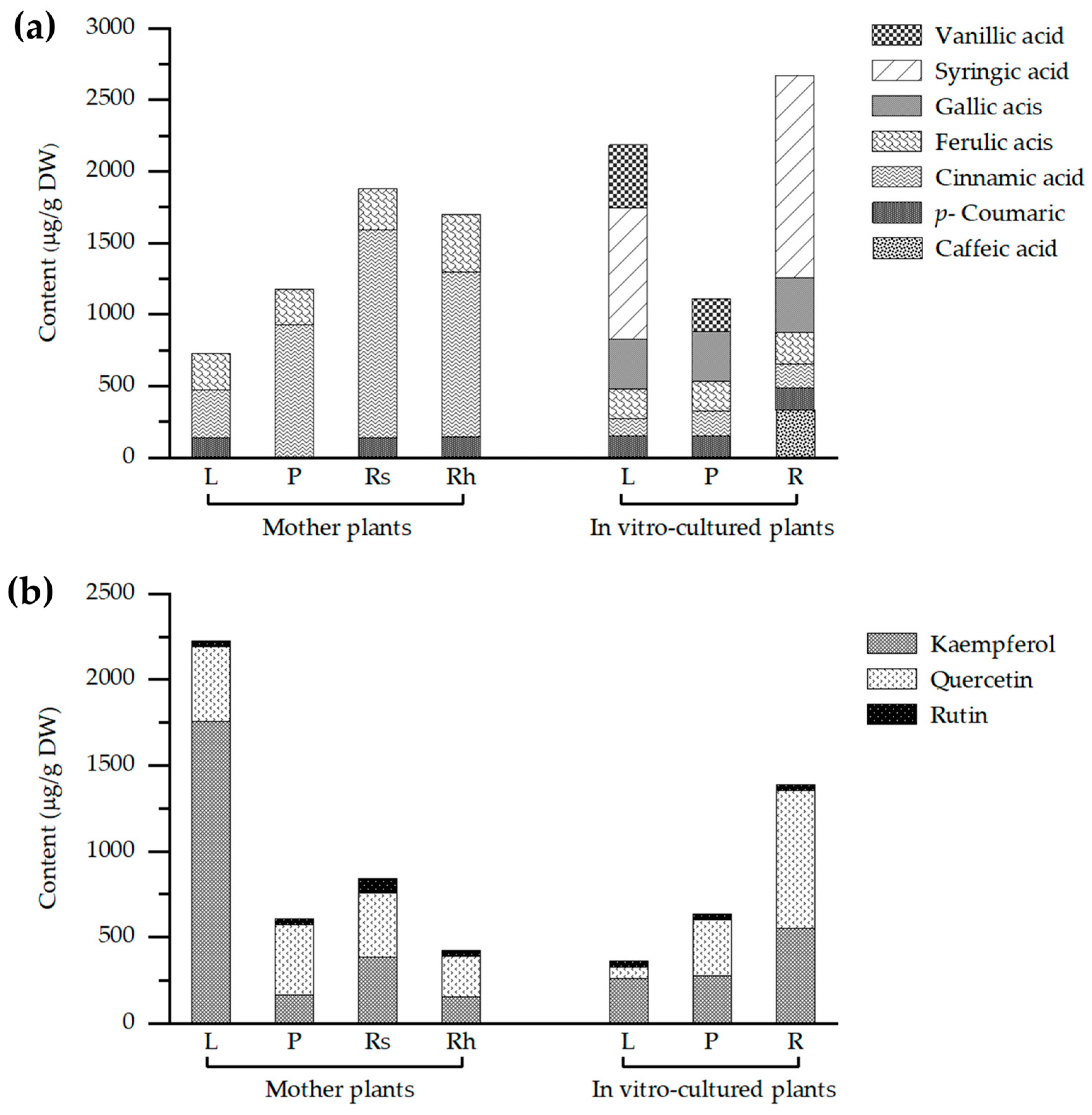 By contrast, in vitro-cultured plants exhibited a broader spectrum of phenolic acids, including caffeic acid, p-coumaric acid, cinnamic acid, ferulic acid, gallic acid, syringic acid, and vanillic acid. Vanillic acid was detected only in leaves and pseudostems, at concentrations of 442.12 and 230.19 μg/g DW, respectively. High levels of syringic acid were observed in roots (1418 μg/g DW) and leaves (917.61 μg/g DW).