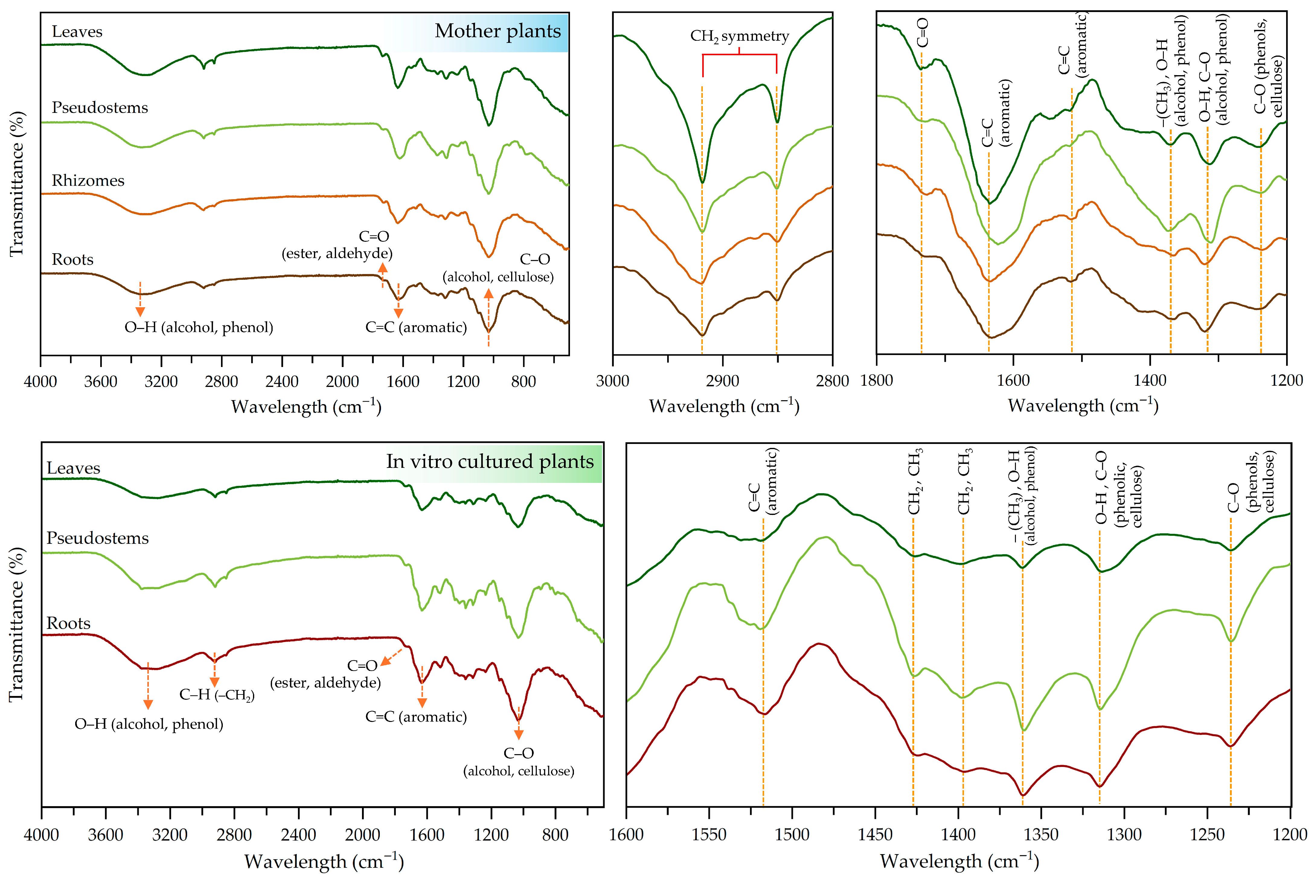 The FTIR technique was employed to identify the vibrational functional groups of organic compounds in Globba sirirugsae samples derived from the wild plants and in vitro-cultured plants (Table 9 and Figure 8). In both conditions, a broad absorption peak around 3330–3320 cm−1 was observed, corresponding to O–H stretching vibrations of alcohols and phenols [61]. Peaks observed around 2918–2929 cm−1 and near 2580 cm−1 were attributed to the asymmetric and symmetric C–H stretching vibrations of methylene (–CH2) groups associated with long aliphatic segments in cellulose and hemicellulose structures [62,63]. The region between 1730 and 1735 cm−1 indicated the presence of carbonyl (C=O) groups, suggesting esters or aldehydes [64]. The peaks at 1631–1642 cm−1 and 1516–1524 cm−1 were assigned to C=C stretching in aromatic groups commonly associated with phenolic compounds [62]. Bending vibrations of –CH2 and –CH3 groups were found at 1426–1396 cm−1 [63]. These peaks are commonly present in polysaccharide matrices. The band at 1360–1370 cm−1 was assigned to the symmetric bending vibrations of methyl (–CH3) groups [65] or O–H bending vibrations of alcohol and phenol groups [64]. The absorption peak at 1314–1320 cm−1 was primarily associated with O–H bending vibrations, potentially coupled with C–O stretching. These bands are typical in hydroxyl-rich structures such as phenolics, flavonoids, cellulose and other plant-derived polysaccharides [63,66]. C–O stretching vibrations were also observed at 1235–1244 cm−1 and 1032–1034 cm−1. The former corresponded to aryl ether linkages and phenolic C–O stretching, while the latter was associated with C–O stretching of primary alcohol groups. These functional groups are commonly found in cross-linked polyphenolic structures present in lignin [64,67].