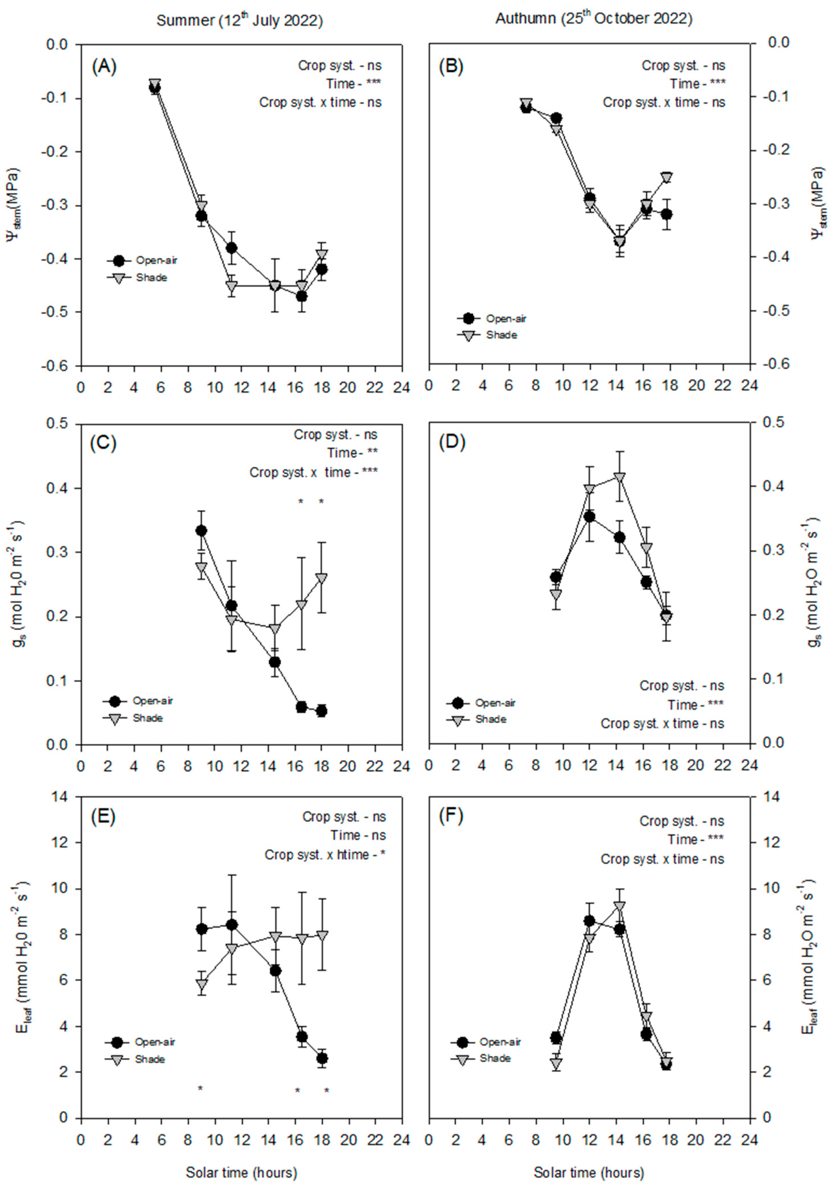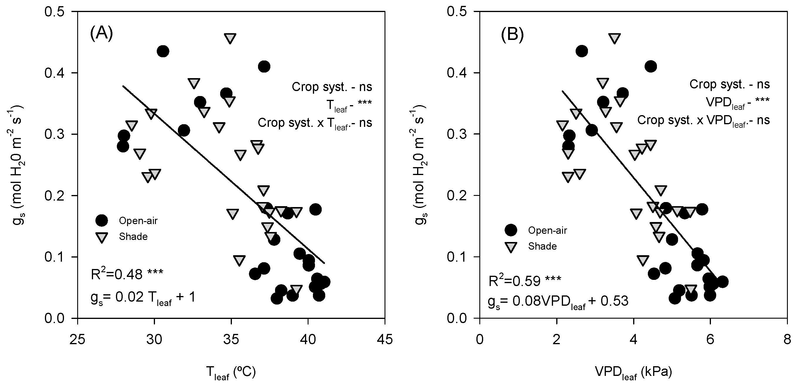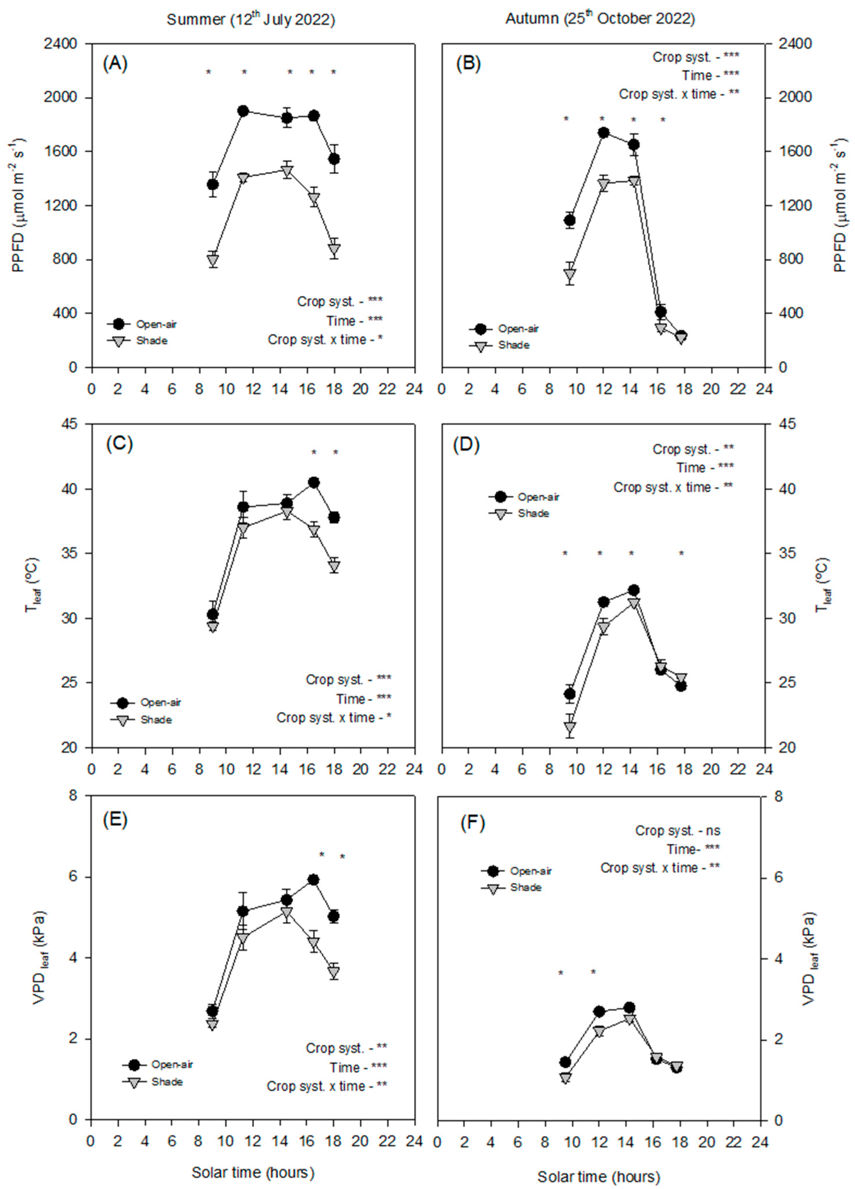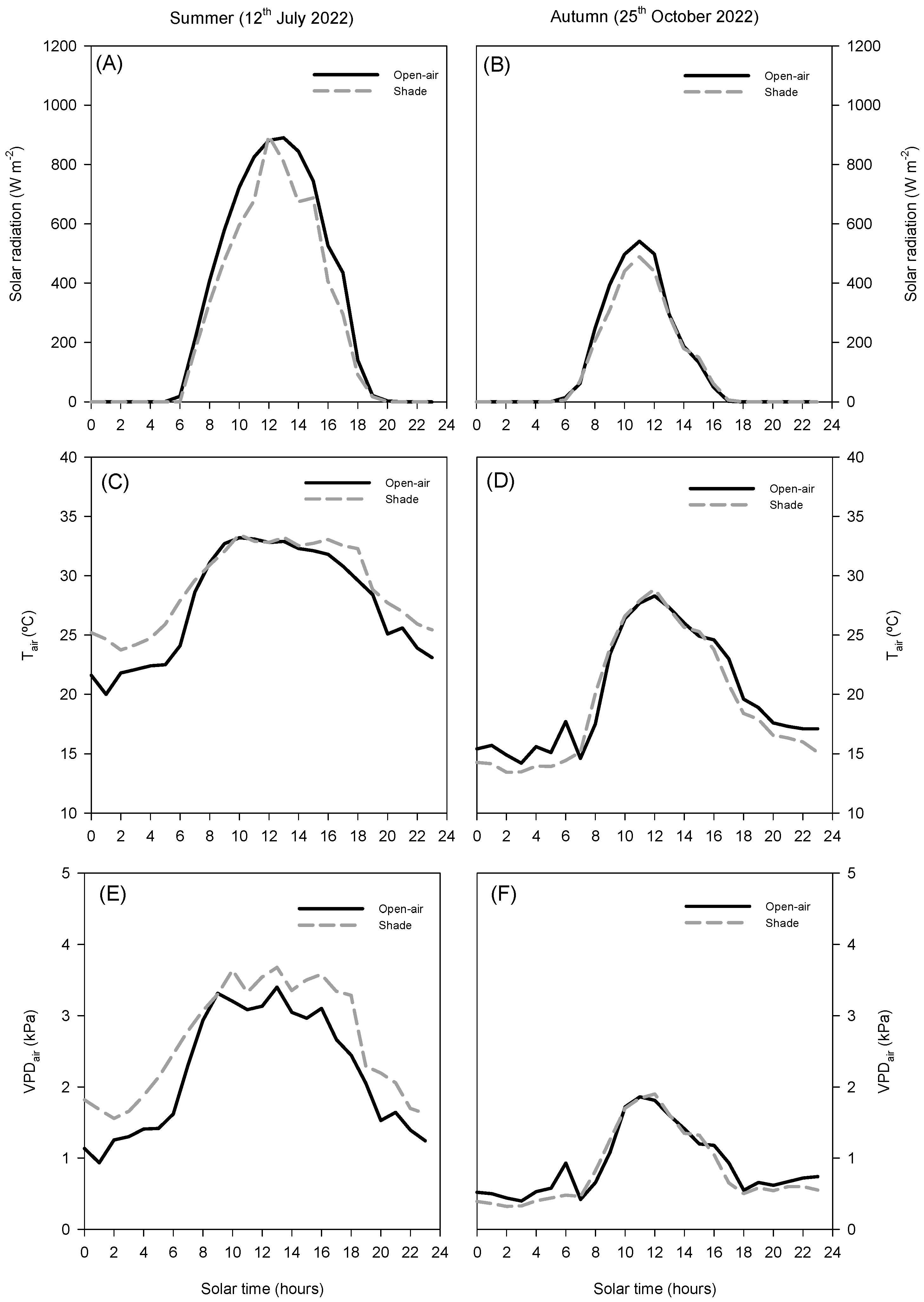Figure 1B,D,F) These seasonal differences were further amplified at the leaf level, where contrasting microclimatic conditions developed around the canopy in open-air and shaded trees (