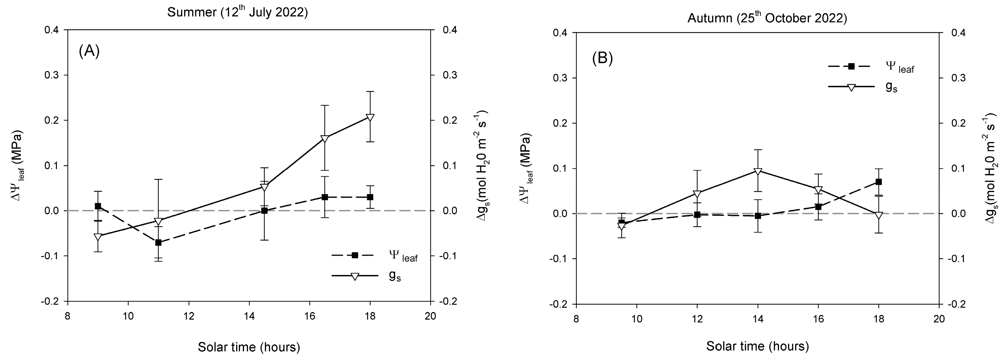 gs revealed a more dynamic response. While values were near zero in the morning, the difference between systems increased progressively during the afternoon, reaching positive values. This pattern indicates that shaded trees exhibited higher stomatal conductance when atmospheric demand and leaf temperature were at their peak (
