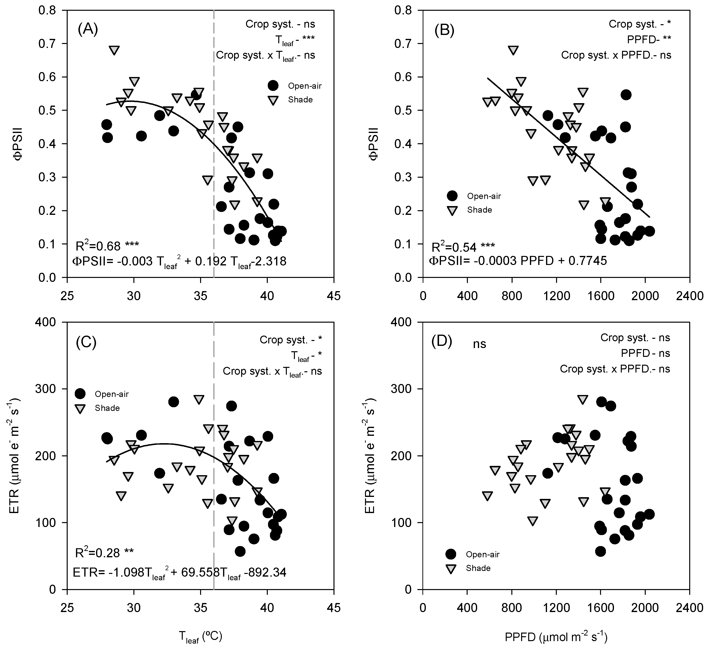 Figure 8C). This indicates that under field conditions, avocado leaves were already operating close to their thermal optimum. However, at higher temperatures, open-air leaves tended to exhibit a sharper decline in ETR, suggesting the onset of heat-induced inactivation of PSII or reduced re-oxidation of the plastoquinone pool [
