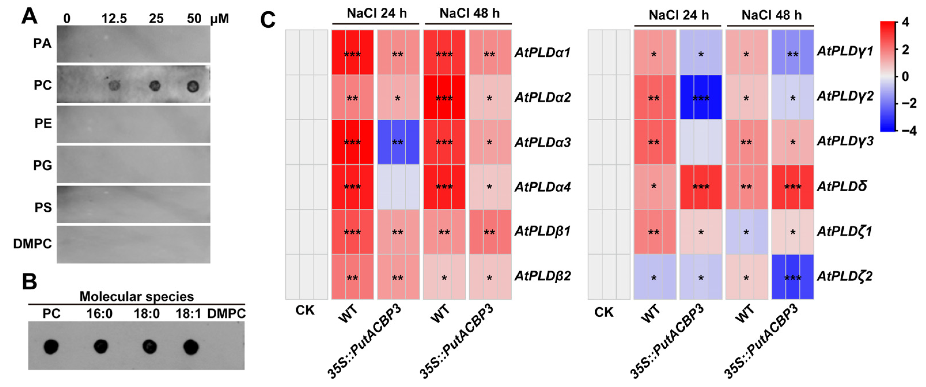 3.3. PutACBP3 Enhances Salinity Tolerance via PC Binding and PLDδ Activation