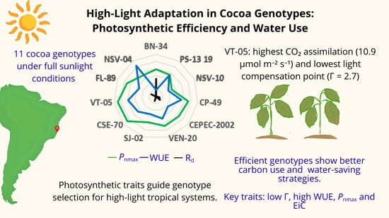 The importance of this study lies in its contribution to understanding the physiological and photosynthetic responses of cacao genotypes cultivated under full-sun conditions, a system increasingly adopted to enhance productivity. By identifying genotypes with greater photosynthetic efficiency, water use efficiency, and carbon assimilation capacity, this work provides essential information for breeding programs and for developing management strategies adapted to high-radiation and low-rainfall environments. Furthermore, the results strengthen the scientific basis for the sustainable intensification of cacao cultivation in tropical regions, supporting both environmental resilience and economic performance.