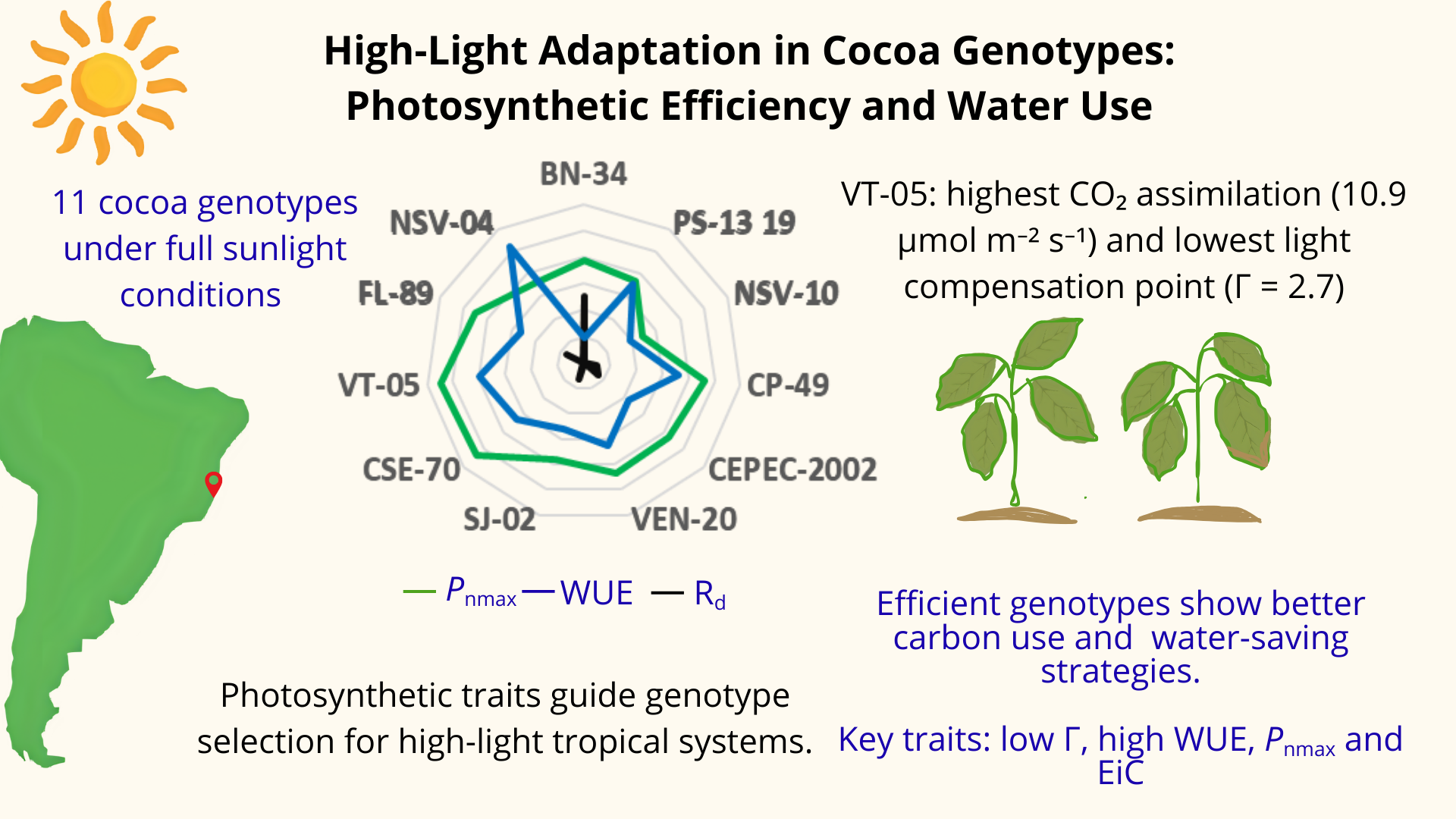 12]. Considering cacao’s susceptibility to photoinhibition under high light intensity and the lack of studies on the photosynthetic response of genotypes in field conditions, this study hypothesizes that genotypes with higher photosynthetic efficiency and better water use are more adapted to full sun cultivation. Therefore, the aim of this study is to evaluate the photosynthetic light response curve and the photosynthetic performance of eleven cacao genotypes grown under full sun in field conditions.