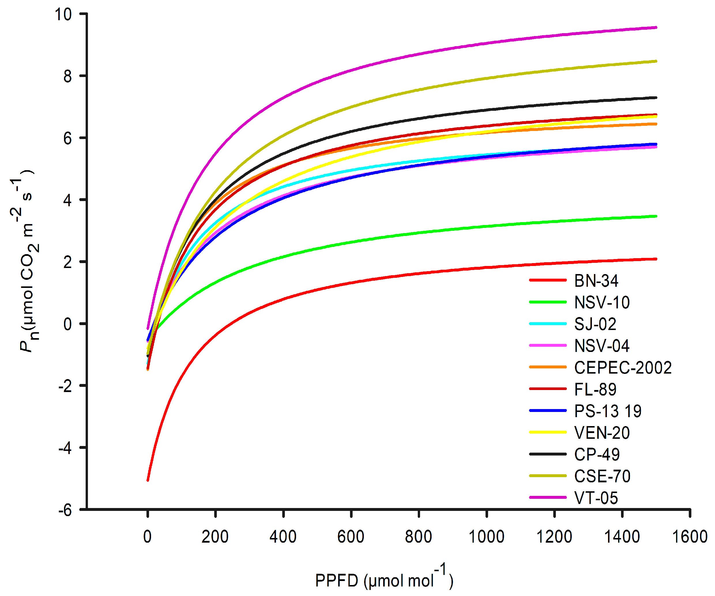 Pn) as a function of irradiance (PPFD), is an essential tool for characterizing the photosynthetic performance and physiological plasticity of genotypes [