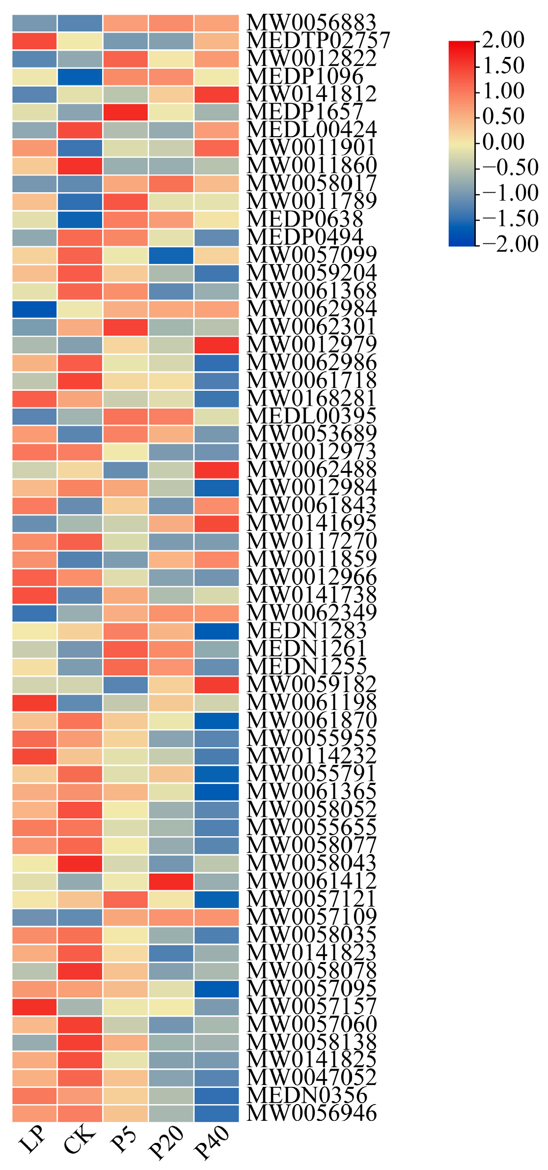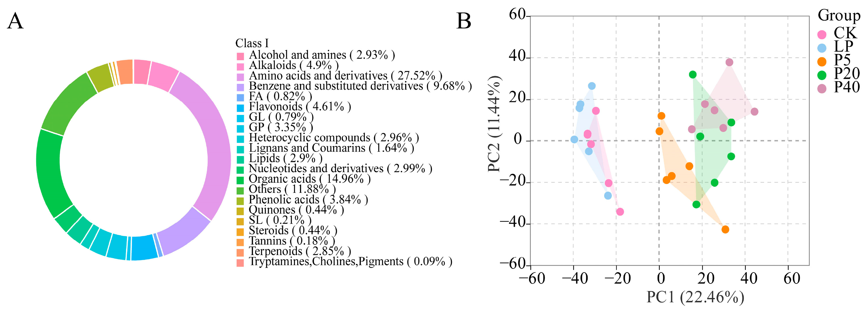 2.3. Metabolome Analysis of P. wrightii Under Different Phosphorus Stress