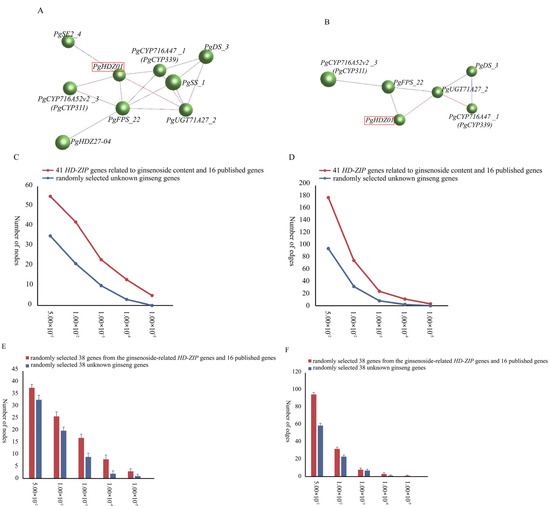 Co-expression networks of 41 PgHD-Zip candidate genes associated with ginsenoside content and 16 published ginsenoside biosynthesis genes. The interaction networks were constructed with different p-value thresholds: (A) ≤10−3 and (B) ≤10−4. Node and edge comparisons were made between the networks of 41 PgHD-Zip candidate genes and 16 key ginsenoside biosynthesis genes versus 57 randomly selected genes from the ginseng transcriptome database at various p-value thresholds (C,D). Networks were also constructed by randomly selecting 38 sequences from the 41 PgHD-Zip candidate genes, 16 ginsenoside biosynthesis genes, and the ginseng transcriptome database. The number of nodes and edges was calculated for each network at different p-value thresholds, with the analysis repeated 20 times for robustness (E,F).