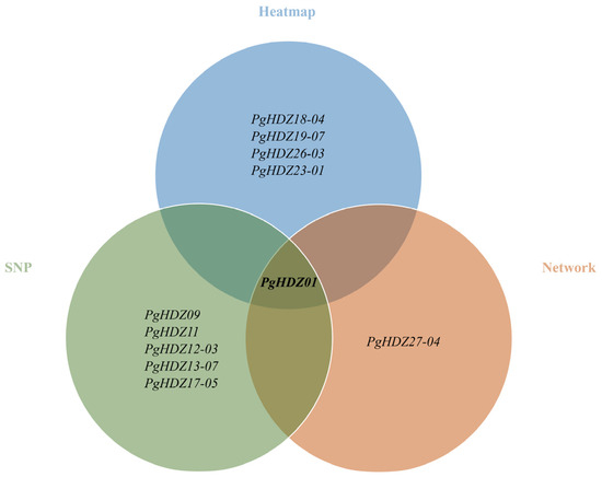 Additionally, further analysis of the 367 SNP mutations across all 117 HD-Zip gene transcripts and their correlation with ginsenoside content (Supplementary Table S2) revealed that 13 SNPs from 6 transcripts (PgHDZ01, PgHDZ09, PgHDZ11, PgHDZ12-03, PgHDZ13-07, and PgHDZ17-05) were significantly associated with changes in monomer or total ginsenoside content (p-value ≤ 10−3), suggesting that these genes may play an important regulatory role in the biosynthesis of ginsenosides in ginseng. These six genes were chosen for the final Venn diagram analysis.