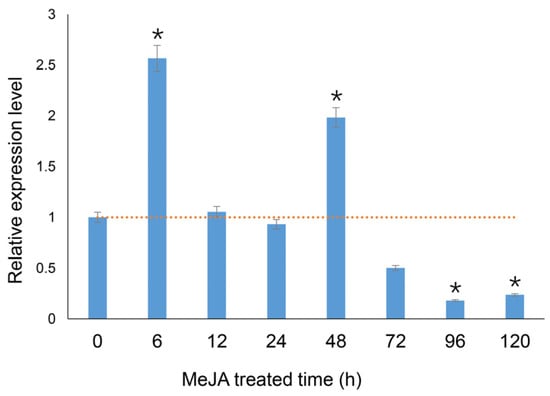 Function validation of the PgHDZ01 gene, which is highly associated with ginsenoside biosynthesis, in MeJA-induced hairy roots of ginseng. The figure shows the relative expression levels of the PgHDZ01 gene, which is strongly correlated with ginsenoside synthesis, under MeJA treatment. The X-axis represents the treatment duration (0–120 h), while the Y-axis shows the relative gene expression levels. The dashed horizontal line indicates the baseline expression level (set as 1.0) of the untreated control (0 h). Asterisks (*) indicate statistically significant differences, with * p-value ≤ 0.05.