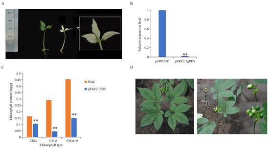 Establishment of the ginseng VIGS system. (A) VIGS gene silencing of pTRV2: PgPDS using ginseng embryos as explants. The left panel shows wild-type ginseng plants with normal pigmentation, while the right panel shows pTRV2: PgPDS-silenced ginseng plants exhibiting albino-like plants. (B) Detection of relative expression level of PgPDS gene after VIGS. The X-axis compares PgPDS gene expression levels between the VIGS-silenced pTRV2: 00 control group (empty vector) and albino plants in which the PgPDS gene was silenced with pTRV2: PgPDS. The Y-axis represents relative gene expression levels. Asterisks (*) denote statistically significant differences (** p-value ≤ 0.01). (C) Comparison of chlorophyll content in wild-type ginseng leaves versus pTRV2: PgPDS-silenced ginseng leaves. The X-axis represents different chlorophyll types (e.g., chlorophyll a, b), and the Y-axis shows chlorophyll content measured in mg/g of leaf tissue. Asterisks (*) denote statistically significant differences (** p-value ≤ 0.01). (D) VIGS gene silencing of pTRV2: PgPDS using four-year-old flower-stage ginseng leaves as explants. The left panel shows wild-type plants with normal leaf and flower pigmentation, while the right panel shows pTRV2: PgPDS-silenced plants with white fruits, indicating successful silencing of PgPDS.