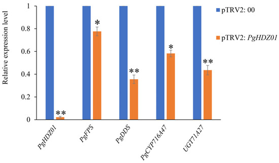Detection of relative expression levels of ginsenoside biosynthesis-related genes after VIGS of the PgHDZ01 gene. The X-axis shows a comparison of the expression levels of the PgHDZ01 gene and key genes involved in ginsenoside biosynthesis between two groups: the VIGS-silenced pTRV2: 00 control group and the pTRV2: PgHDZ01-silenced albino plants. The Y-axis represents the relative gene expression levels. Asterisks (*) indicate statistically significant differences between groups (* p-value ≤ 0.05; ** p-value ≤ 0.01).