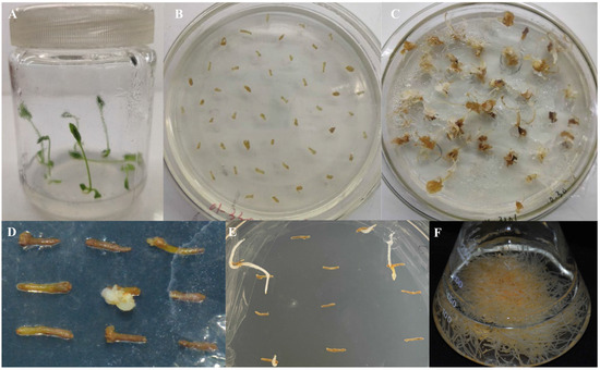 Induction of ginseng hairy roots. (A) Ginseng seedlings cultured under standard conditions. (B) Various tissue parts of ginseng seedlings, including roots and stems, were cut into small sections for pre-culture. (C) Induction culture of ginseng hairy roots. Explants were inoculated with A. rhizogenes for co-cultivation, followed by transfer to selection medium. (D,E) Single-root culture of the induced hairy roots. Induced hairy roots were excised and subcultured individually for further growth. (F) Expansion culture of a single induced hairy root line in liquid medium to promote growth.