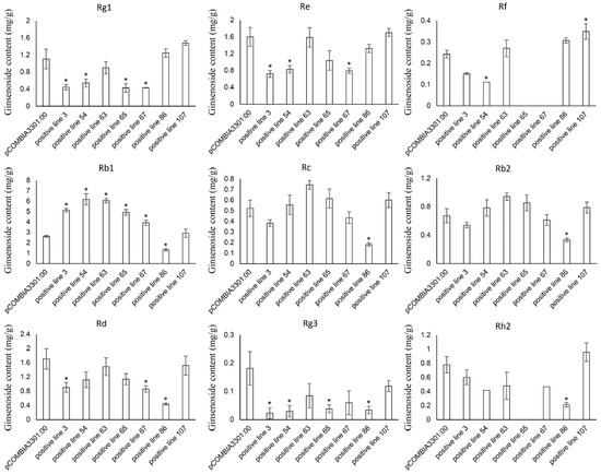 Mono-ginsenoside content in positive hairy root lines that overexpressed PgHDZ01. The X-axis represents the different ginseng hairy root lines with positive overexpression of PgHDZ01, while the Y-axis shows the ginsenoside content (mg/g DW) measured from these lines. Asterisks (*) denote statistically significant differences between the overexpression lines and the control group (* p-value ≤ 0.05).