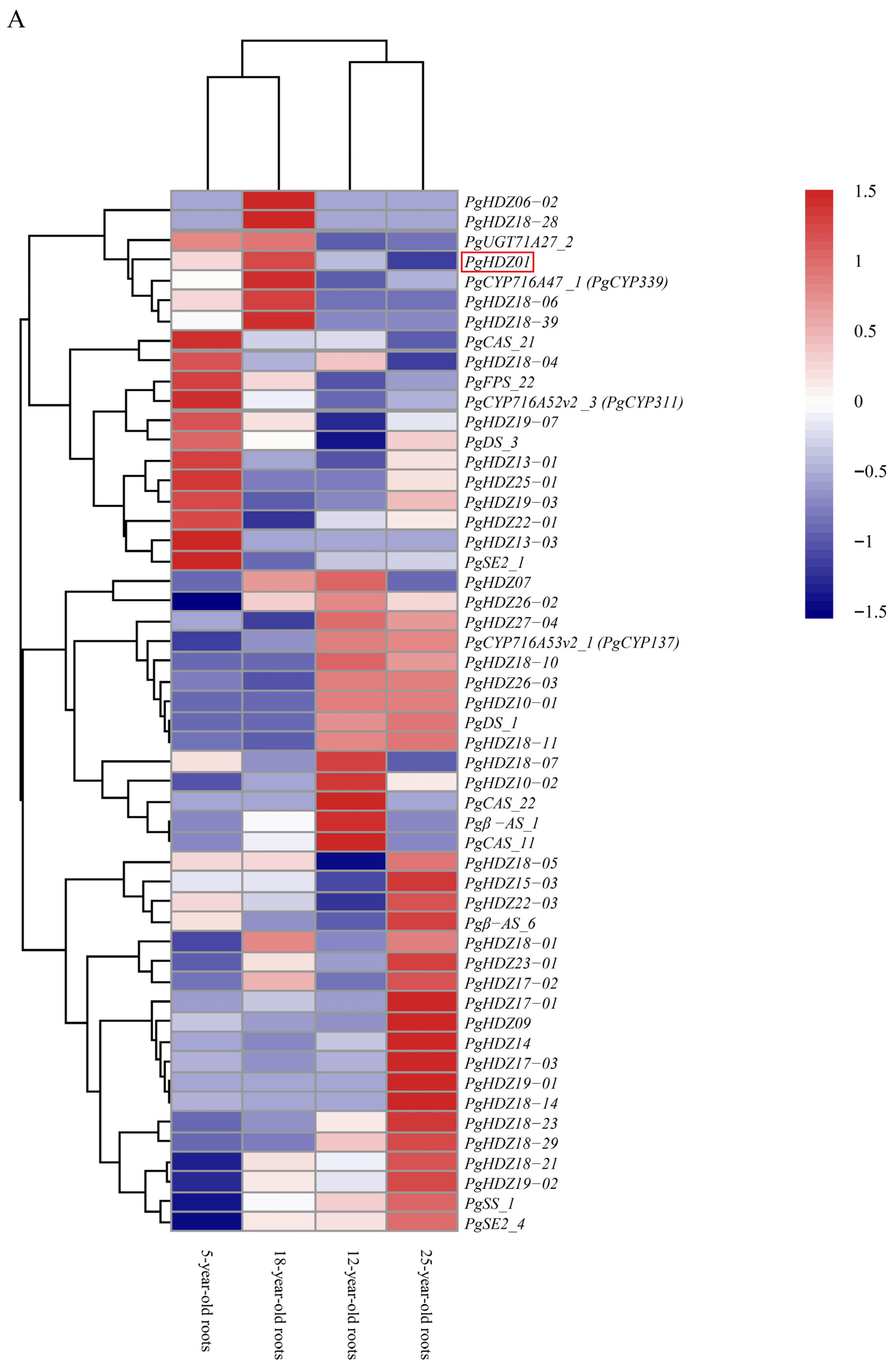 Wang, C.; Cheng, X.; Li, L.; Liu, R.; Wang, D.; Jiang, Y.; Wang, Y.; Wang, K.; Zhao, M.; Wang, Y.; et al. Functional Study of PgHDZ01 Gene Involved in the Regulation of Ginsenoside Biosynthesis in Panax ginseng. Plants 2025, 14, 3562. https://doi.org/10.3390/plants14233562