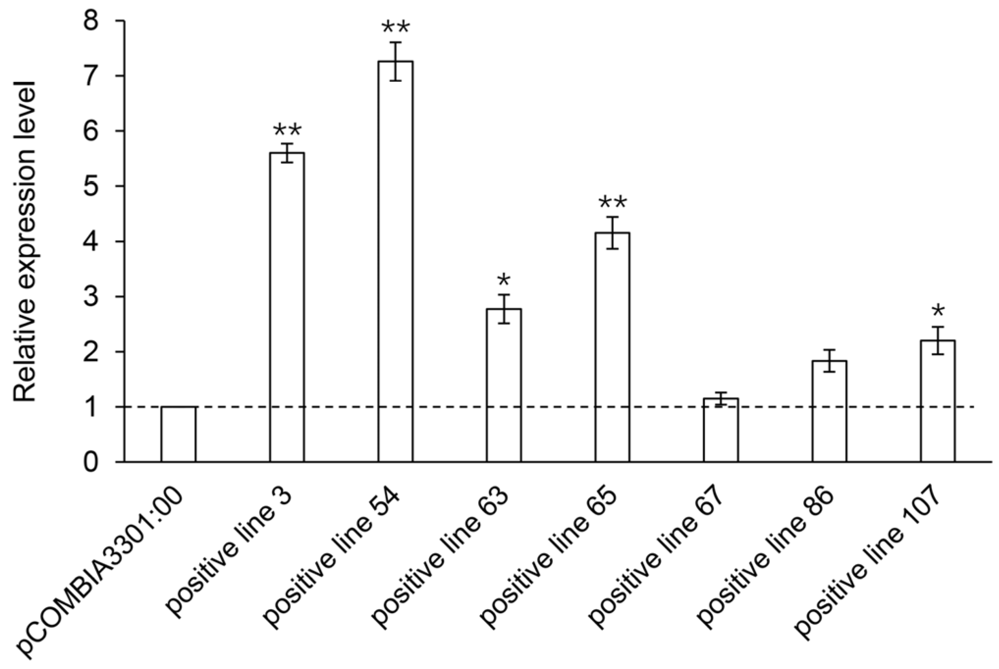 3.5. Genetic Transformation of Overexpression Vector and Detection of Positive Transformants
